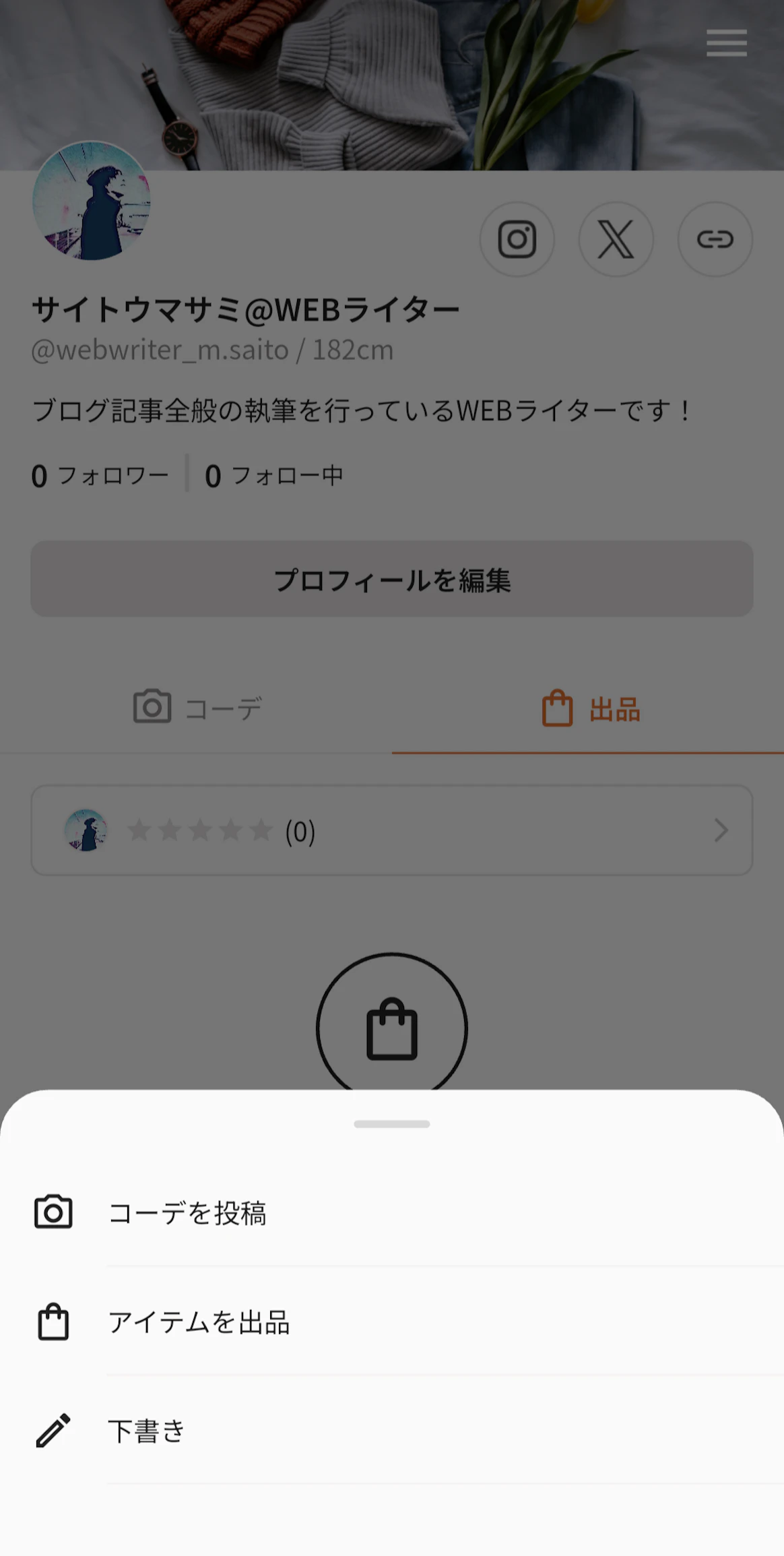 すると、ポップアップが出てきてコーデと出品、下書きの3つの選択肢が現れるので、真ん中の「アイテムを出品」を選びます。