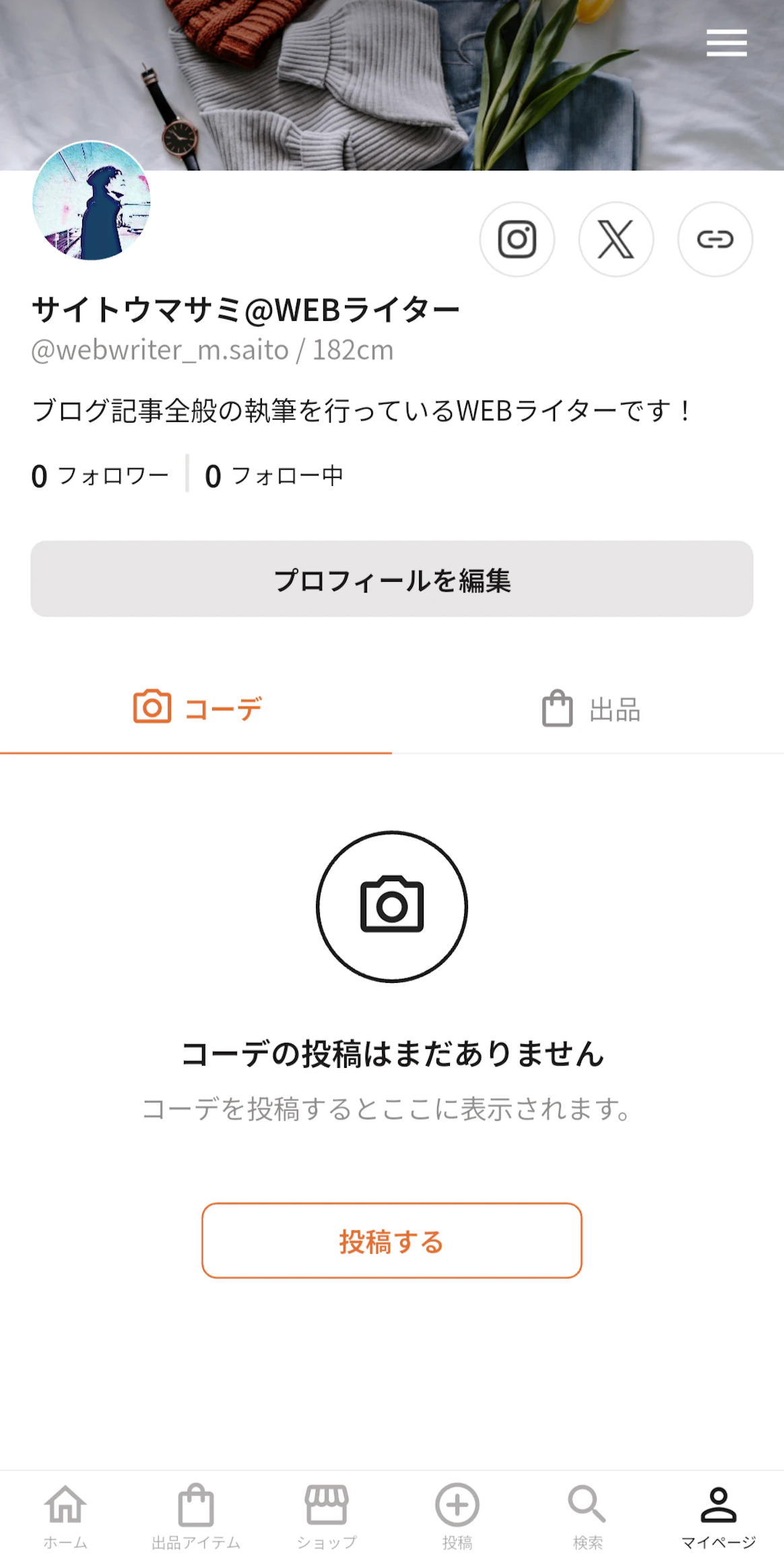 そして、アプリ画面の下部にホームや出品アイテムなどのアイコンが6つほど並んでいますが、そのなかの「投稿」をタップします。