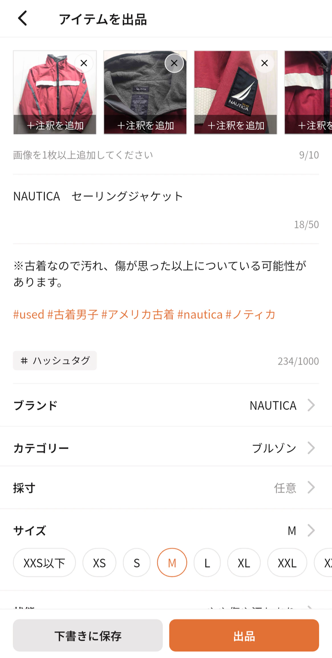 今回、私は滅多に着用しなくなってしまったNAUTICAのセーリングジャケット(ブルゾン)を出品してみましたが、ネットやVINTYの情報を加味して12,000円と値付けしました。