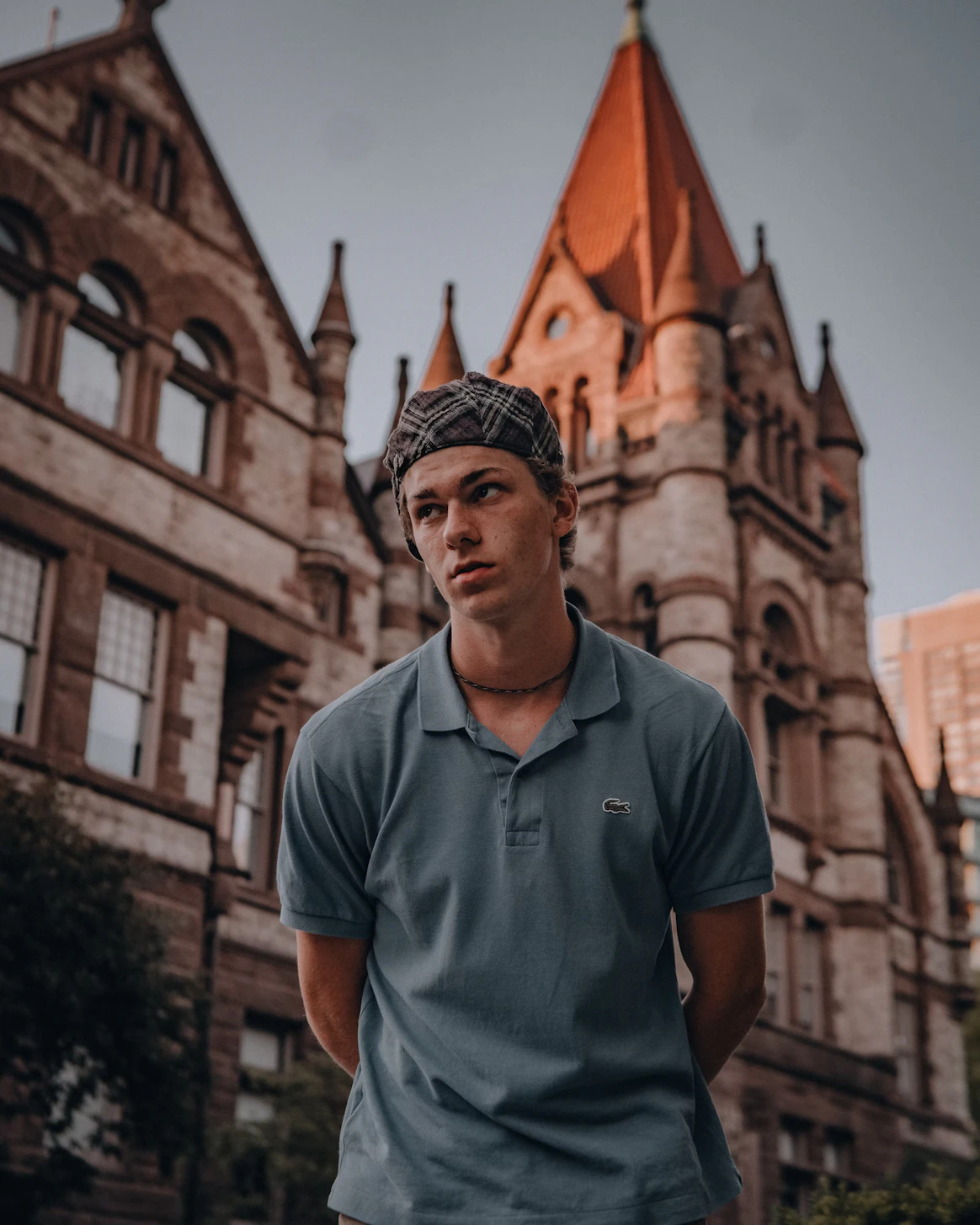 ポロシャツにチノパンのシンプルなストリートスタイルですがカラーやサイズの選び方が絶妙です。