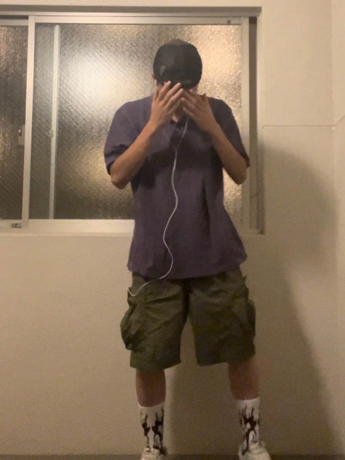 黒のシンプルなポロシャツにショートタイプのカーキのカーゴパンツを合わせたストリートスタイル。