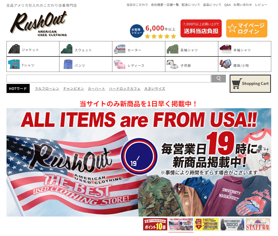 オンラインで安く古着を購入したいなら、大手オンライン古着屋として高い知名度を誇る「Rush Out」は要チェックです。