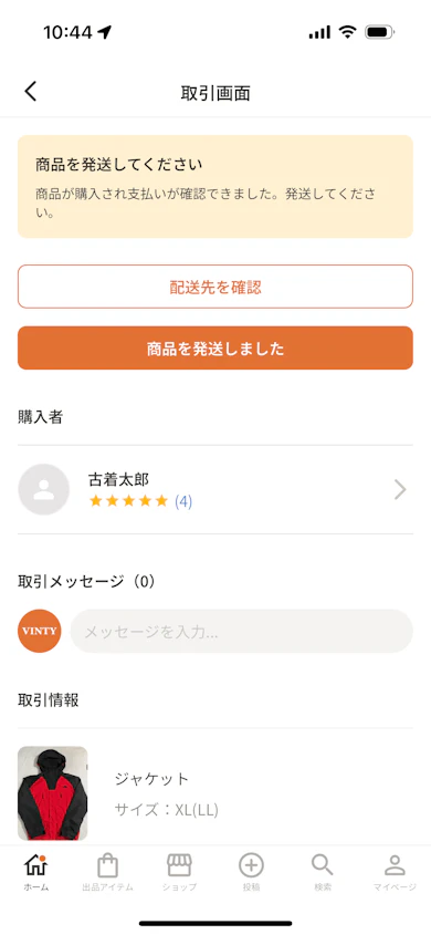 VINTYで出品した商品が購入されたら、まずは発送先となる購入者の住所をアプリにて確認しましょう。