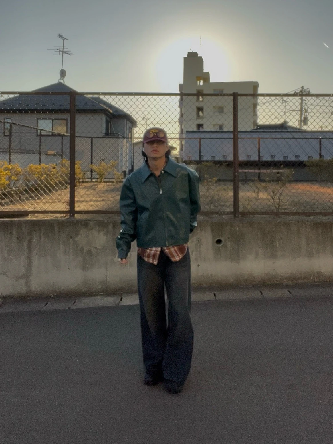 短丈のレザージャケットをビッグシルエット気味に着こなしています。チェックシャツとの相性も良く、ボトムの緩めのシルエットも相まって、全体的にトレンド感のある着こなしになっています。