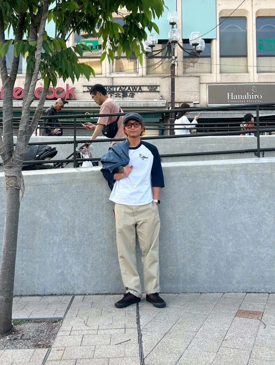 白×ネイビーのラグランスリーブTシャツにベージュのチノパンを合わせたシンプルなアメカジスタイル。