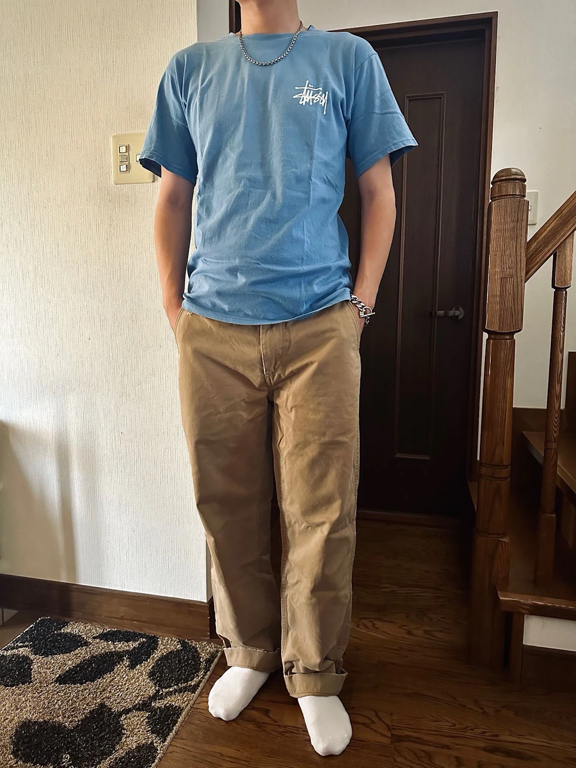 90年代スタイルに最適なステューシーのブルーのTシャツにベージュのチノパンを合わせたストリートスタイル。