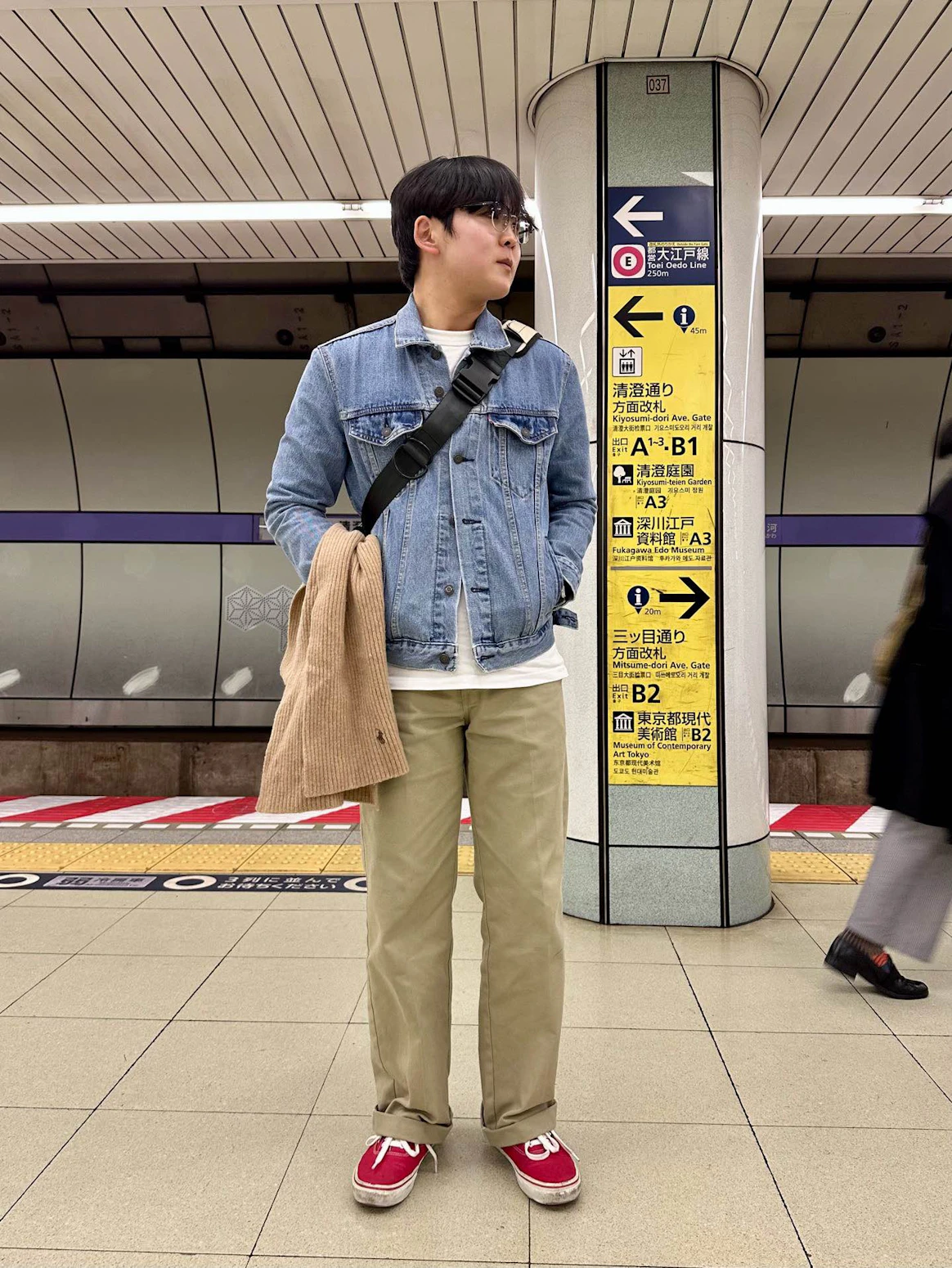 ウォッシュドの効いたデニムジャケットにベージュのチノパンを合わせた王道のアメカジスタイル。