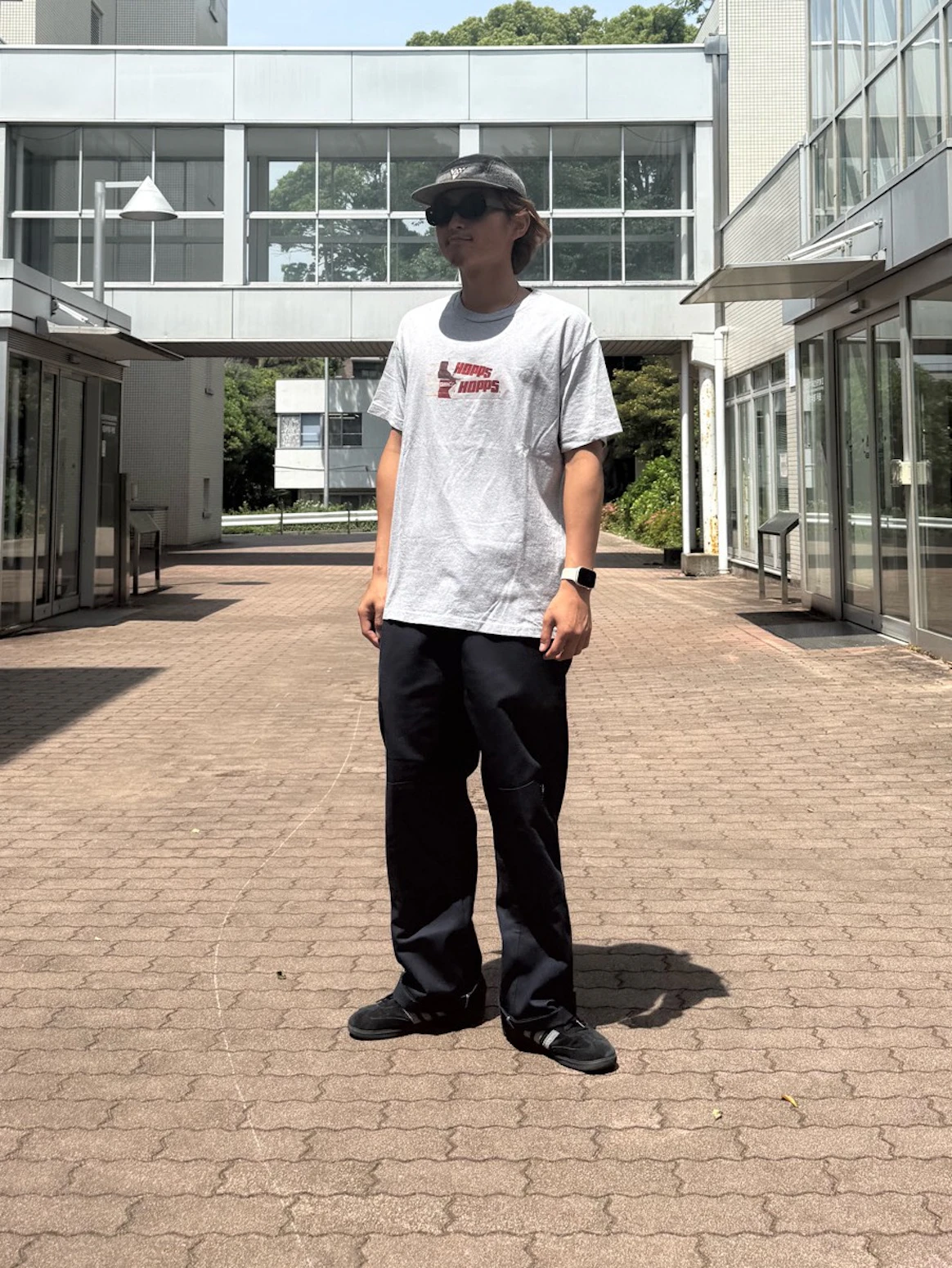 白に近いライトグレーのプリントTシャツに黒のチノパンを合わせたオーセンティックなアメカジスタイルです。