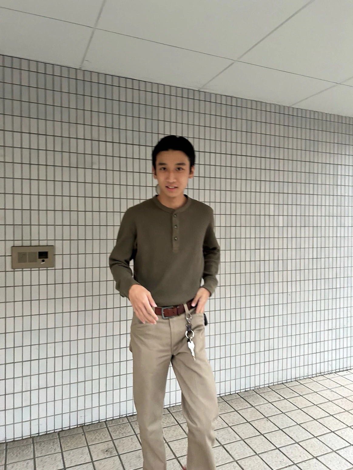 カーキのヘンリーネックTシャツをベージュのチノパンにタックインした骨太なスタイルです。
