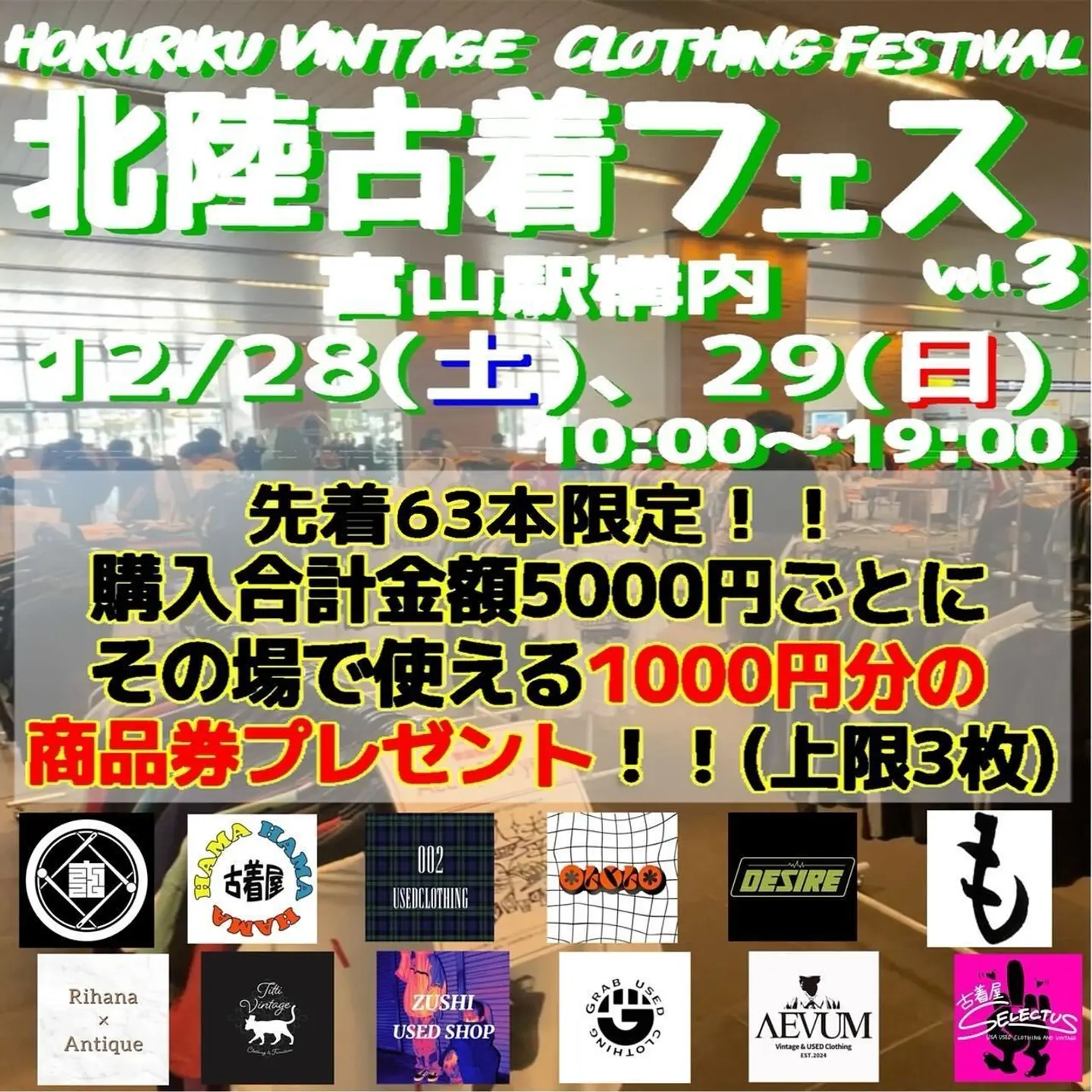 12月28日(土)29日(日)2024年最後の北陸古着フェス‼️ ちょっと早いお年玉で5000円ご購入していただきますとその場で使える1000円の商品券をプレゼント🎁 ぜひご来店ください🙏 商品券ですがお一人様上限3枚とさせていただいております。 (Instagramより引用)