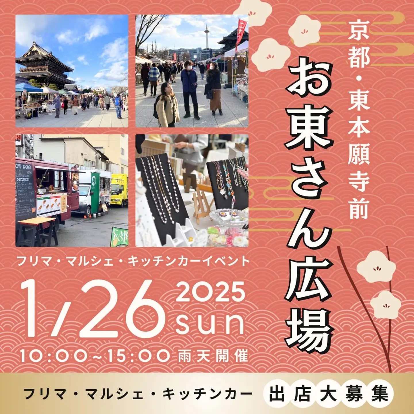 京都駅からもほど近い人気の観光スポット、東本願寺前・お東さん広場で恒例イベントを開催します♪ 古着や家庭の不用品、雑貨などのフリーマーケット&ハンドメイド雑貨などのマルシェです。グルメキッチンカーも並びます! にぎわいのあるイベントへ家族と、恋人と、仲間と遊びに来ませんか~? (ホームページより引用)