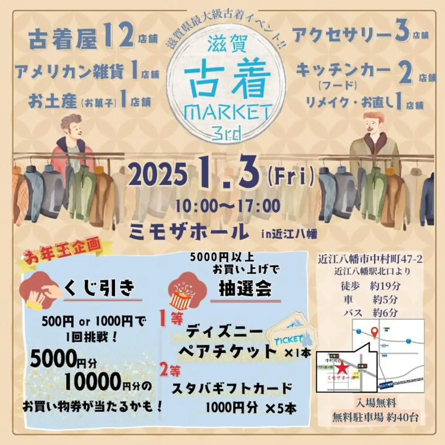 当日は滋賀県内外から ・古着屋16店舗 ・アクセサリー3店舗 ・アメリカン雑貨1店舗 ・フード2店舗、コーヒー1店舗 が出店🧳 ※動画の記載と違いますが本文が正しい出店者数になります (公式Instagramより引用)