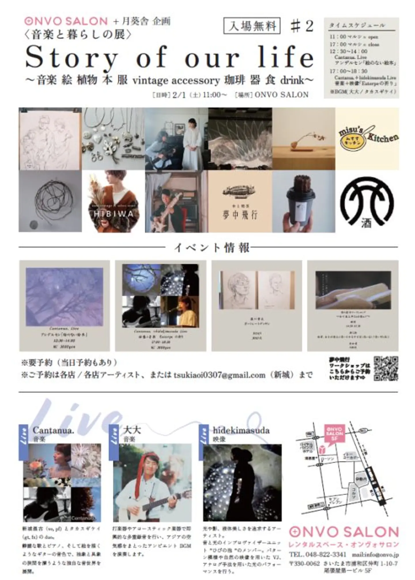 – 音楽 絵 植物 本 服 vintage accessory 珈琲 器 食 drink – 私たちの物語は小さな豊かさに囲まれ日々静かに紡がれています 2/1satに開催される 音楽と暮らしの展 「story of our life#2」では13名の素敵な方々と暮らしの小さな幸せを提案します (ホームページより引用)