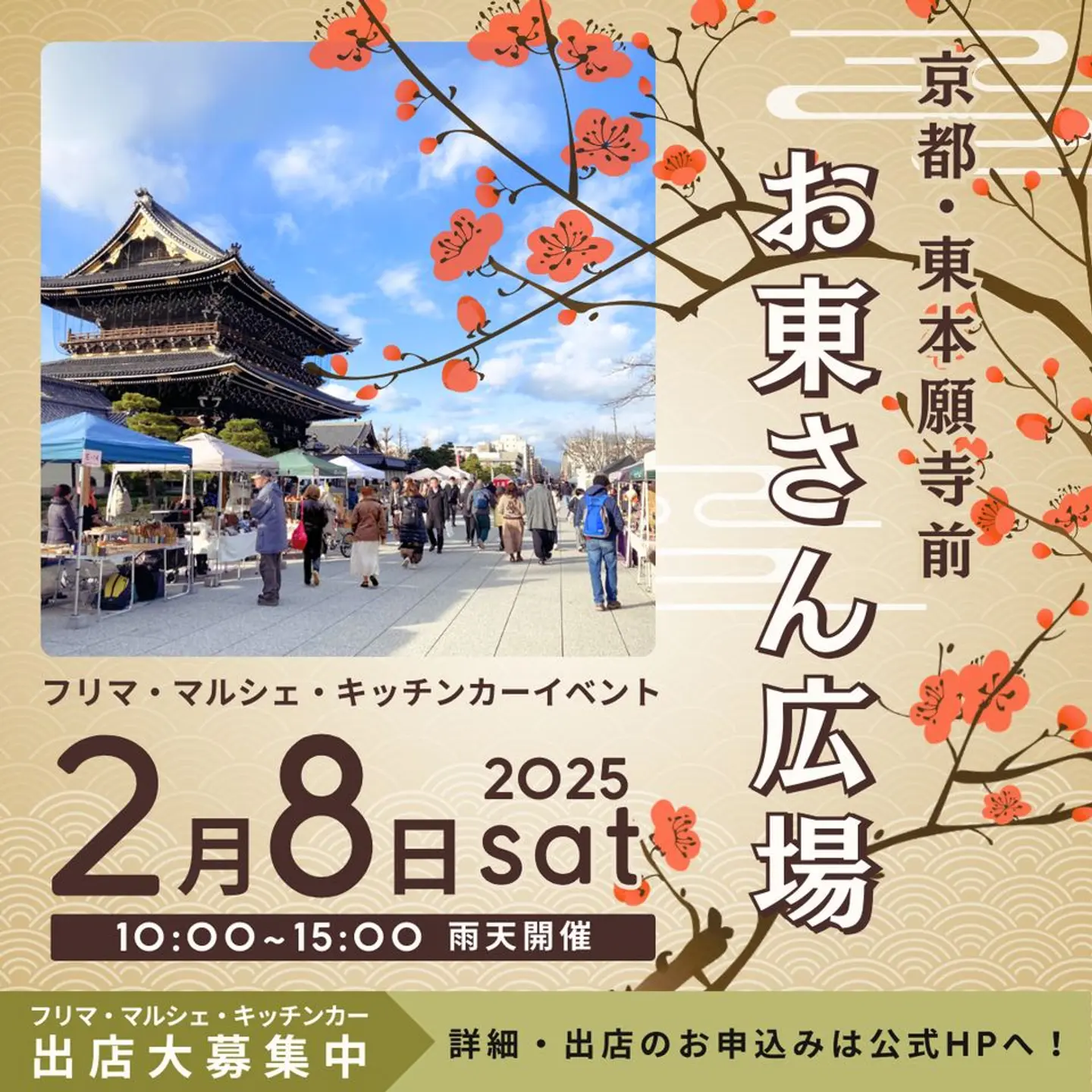 JR京都駅からもほど近い人気の観光スポット、東本願寺前・お東さん広場で恒例イベントを開催します♪ 古着や家庭の不用品、雑貨などのフリーマーケット&ハンドメイド雑貨などのマルシェです。グルメキッチンカーも並びます! にぎわいのあるイベントへ家族と、恋人と、仲間と遊びに来ませんか~? (ホームページより引用)