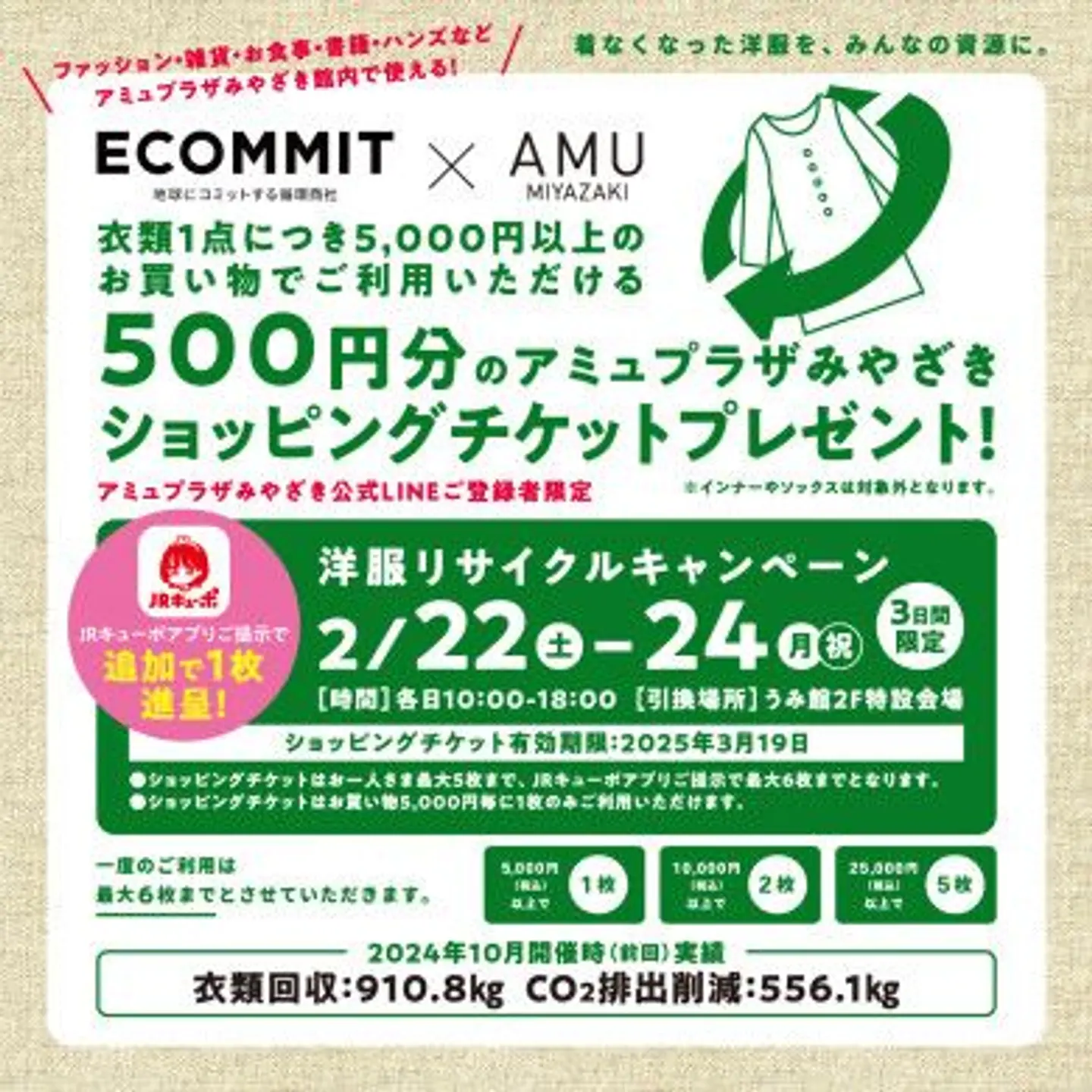 アミュプラザみやざき公式LINEご登録者限定「洋服リサイクルキャンペーン」開催! 不要になった衣類1点につき、5,000円以上のお買い物・お食事でご利用できる 「500円分のアミュショッピングチケット」プレゼント! お一人最大5枚までの進呈となります。JRキューポアプリご提示の方、追加で1枚進呈! ※インナーやソックスは対象外となります。 詳しくは【HP掲載用PDF】洋服リサイクルキャンペーン.pdf <2024年10月開催時(前回)実績> 「衣類回収:910.8kg CO2排出削減:556.1kg」 おかげさまで上記実績となりました。ご協力ありがとうございました。 (ホームページより引用)