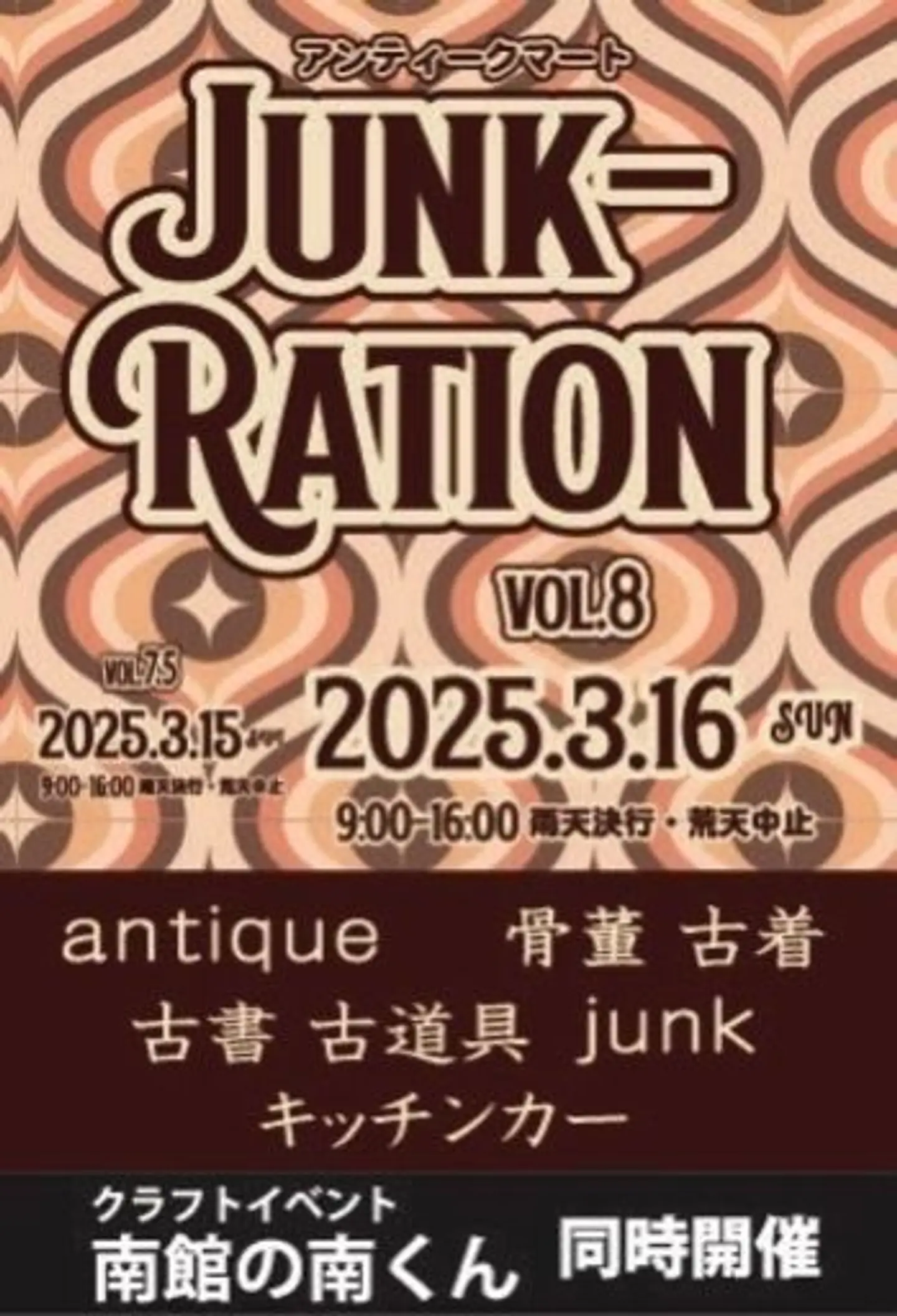 3月15日土曜 古着多めの小さきイベント 【junk ration nano】 午前9時より午後3時まで 3月16日日曜 クラフトイベント【南館の南くん】と合同開催 アンティークマート【junk ration三河】 午前9時より午後4時まで (ジモティーより引用)