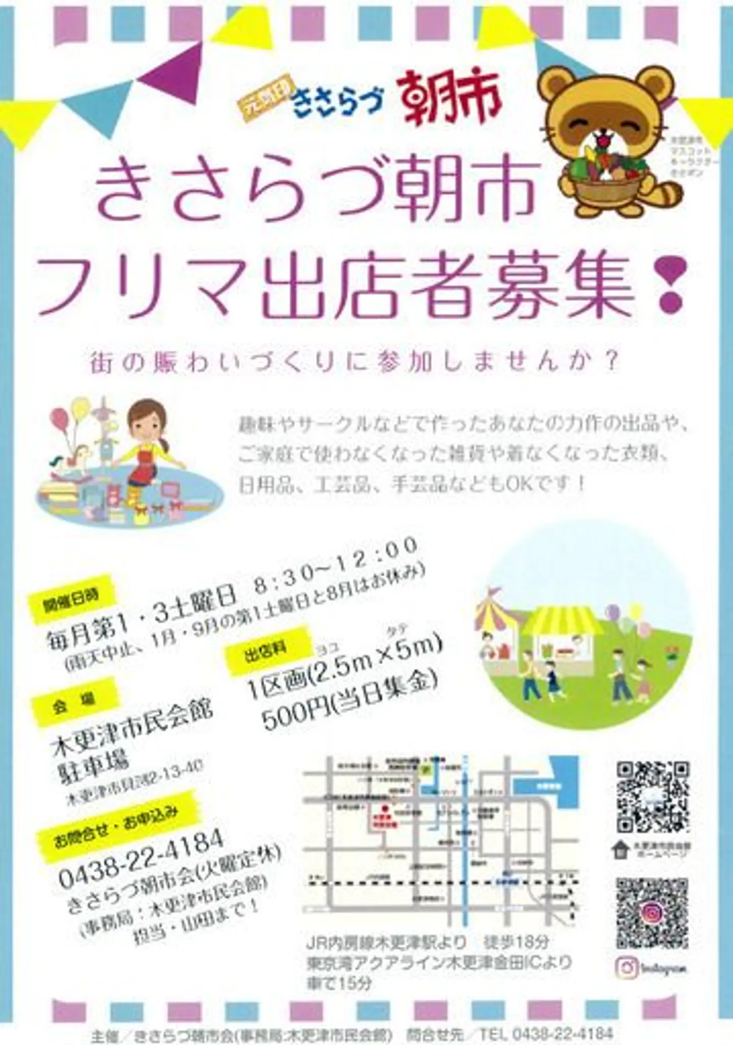 8:30より木更津市民会館の駐車場にて開催。 新鮮な野菜や果物、ハンドメイドの小物・アクセサリー・バッグ、衣類や靴、雑貨、日用品、工芸品、手芸品、キッチンカーなどが所狭しと並びます。 そしてアーティストをお迎えしての野外ライブも毎回開催♪ (ジモティーより引用)