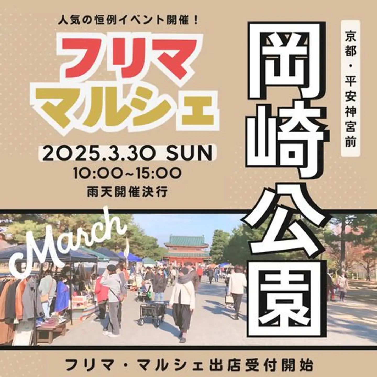 京都の人気観光スポット、平安神宮前・岡崎公園での恒例イベントです♪ 古着や家庭の不用品、雑貨などのフリーマーケット&ハンドメイド雑貨などのマルシェです★ フリマでお宝探し、素敵なハンドメイド雑貨との出会い、おいしいキッチンカーを堪能! 2025年3月、新生活間近の開催です! 出店者様も大募集しております! (ジモティーより引用)