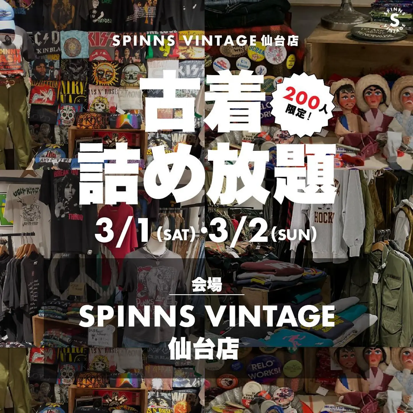- ̗̀ 古着詰め放題 6弾 ̖́- ご好評につき開催決定いたしました👏🏻✨ 毎回たくさんの方にご参加いただいている 大人気イベントとなっております!! 今回も前回同様2日間開催の、 【⠀事前予約制 ⠀】とさせていただきます。 ⚠️予約開始は後日となります «日時» ㅇ3月1日(土) 19:50〜22:00 ㅇ3月2日(日) 9:00〜11:10 ㅇ制限時間20分 ㅇ各枠25人まで «会場» spinns vintage 仙台店 青葉区一番町3-1-20 イブ1番ビル ︎︎︎︎︎︎☑︎当日は現地集合。 レジにて予約画面のご提示、袋のサイズを選択してお支払いをして頂きます。 受付やルール説明を含めた全体の所要時間となっております。実際に詰め放題を行っていただく時間は20分間です。 «金額» 袋Mサイズ 3300円(税込) 袋Lサイズ 5500円(税込) «ルール» ㅇ袋が破れてしまうとその場で終了となります ㅇ片手で3秒持ち上げられたらOK!! ㅇお一人様1袋となります。※2人で1つ=NG «持ち物» ㅇ戦利品達を入れる袋 パンパンの袋を持ち帰るのが大変なので、 ご持参いただくことをオススメしております ㅇイメトレと体力と思いやり 想像以上に時間が過ぎるのが早いし体力消耗します!! 他の方と取り合いになってしまったらじゃんけんしましょう!! «注意点» ⦿現在店頭にある商品ではありません🙅🏻 ⦿動画の内容は前回開催時の商品です。 ⦿古着詰め放題の商品には、汚れや破れ ジッパー破損の商品も含まれております。 ご了承頂いた上でのご参加お待ちしております。 - - - - - - - - - - - - - - - - - ⦿予約方法⦿ ①Instagramをフォロー(@spinns_vintage_sendai ) ②プロフィールのリンクを開く🔗 ③日時を選択して予約 (Instagramより引用)