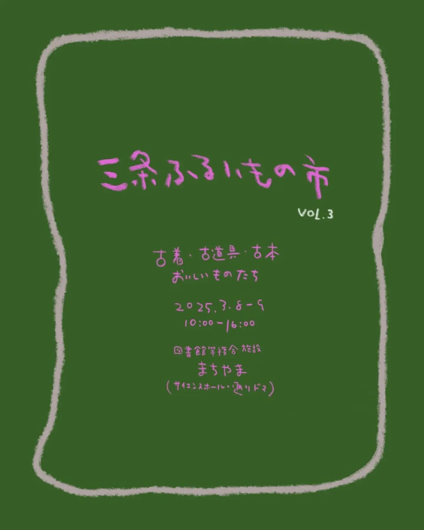 \ vol.3 開催決定 ! / 〈三条ふるいもの市 vol.3〉 日時 2025年3月8・9日(土日) 両日 10:00-16:00 場所 図書館等複合施設 まちやま サイエンスホール・通りドマ @sanjo_machiyama 駐車場・駐輪場はまちやまをご利用ください 飲食スペース まちやま1Fサイエンスラボ1 --- みなさまお待たせしました! フライヤーが完成いたしましたっ! 今回ふるいもの市を一緒に盛り上げてくださる 出店者さまはこちらの皆さまです! (Instagramより引用)