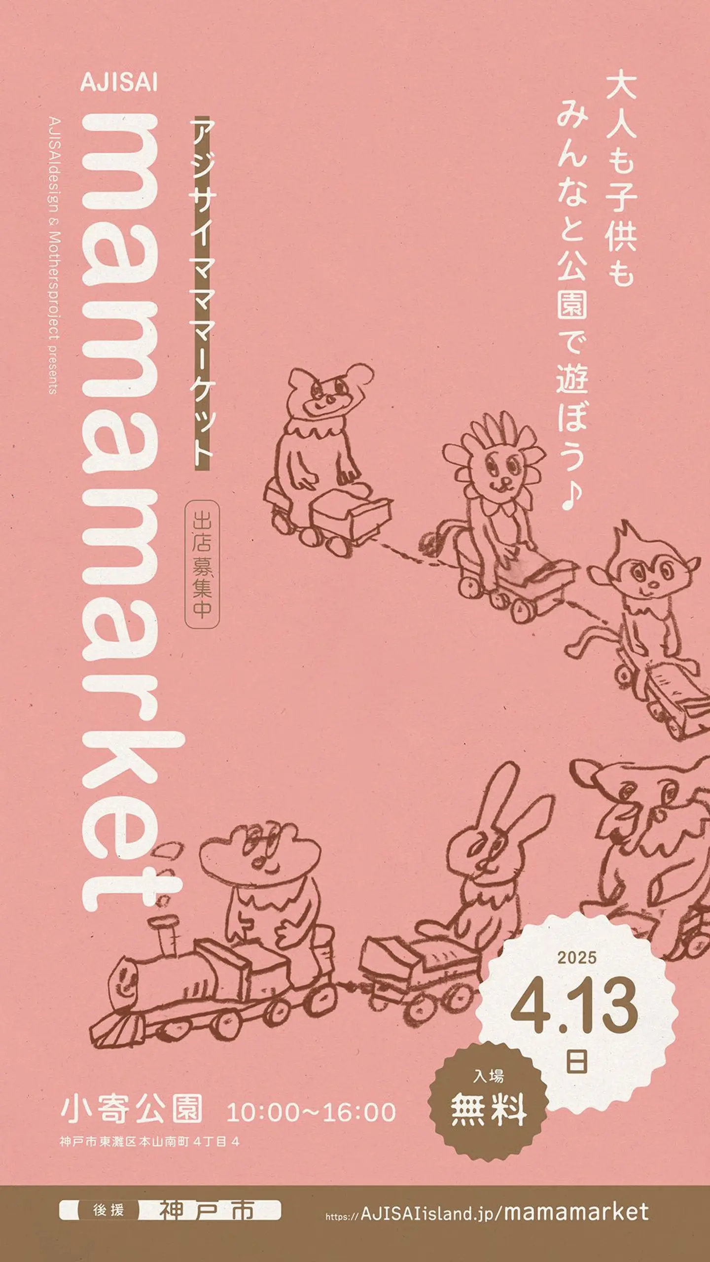 「ヒト」の表現する「モノ・コト」。 アート/音楽/文学/芸/クラフト/ファッション/料理/スポーツなどから 会話や行動などの何気にしていることまで全てが表現でそこに個性があります。 それぞれの個性を表現し合い、人と「ツナガル」、またそれを人に「ツナゲル」。 アジサイマママーケットは、これを目的としたマーケットスタイルのフリーパーティーです。 子育てを通して生まれる喜びや感動を分かち合い、 人との温かい「ツナガリ」を育むことで、 子どもたちとの時間がより豊かになるよう願い開催します。 誰でも(コドモOK)無料で参加でき、出店や展示など(有料)が出来ます。 是非、神戸市東灘区の「小寄公園」で一緒に遊びましょ~!!! みなさまにとって素敵なツナガリができることを願っております♪ (ホームページより引用)