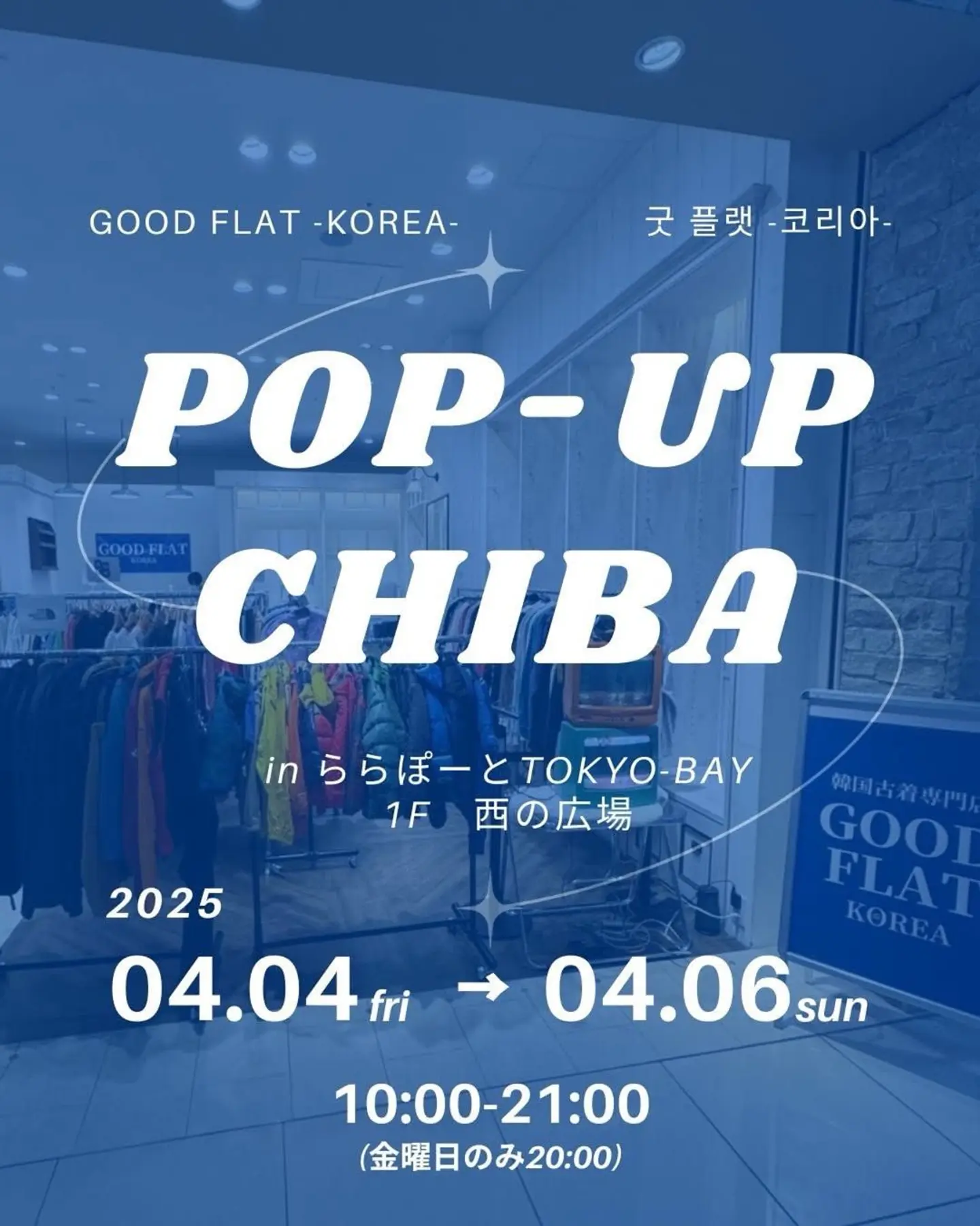 . 韓国カルチャーを取り入れた日本初韓国古着専門店グッドフラットコリアが千葉県船橋市にあるららぽーとTOKYO-BAY店に新規オープン GOOD FLAT-KOREA-(グッドフラットコリア)は 韓国国内で流通している若者に人気な古着で構成された『韓国古着専門店』 現在日本で流通している古着店舗では見えない韓国ブランドで構成されているのが特徴。 日本人バイヤーが、日本で流行している最新のファッショントレンドを取り入れ、日本人の好みにあったセレクトを現地で行っています。 今回は、家族で楽しめる古着屋さんをコンセプトとして、『お店の入りやすさ』『商品の買いやすさ』『商品の品質』を追求し、家族をはじめ今まで古着に触れてこなかったライト層のお客様にも、楽しんで空間創りを行っております。 <千葉県> 会場:ららぽーとTOKYO-BAY 1F (西の広場) 所在地:千葉県船橋市浜町 2-1-1 日程:2025年4月4日(金)~4月6日(日) [営業時間] 10:00~21:00(金曜日のみ20:00) (Instagramより引用)