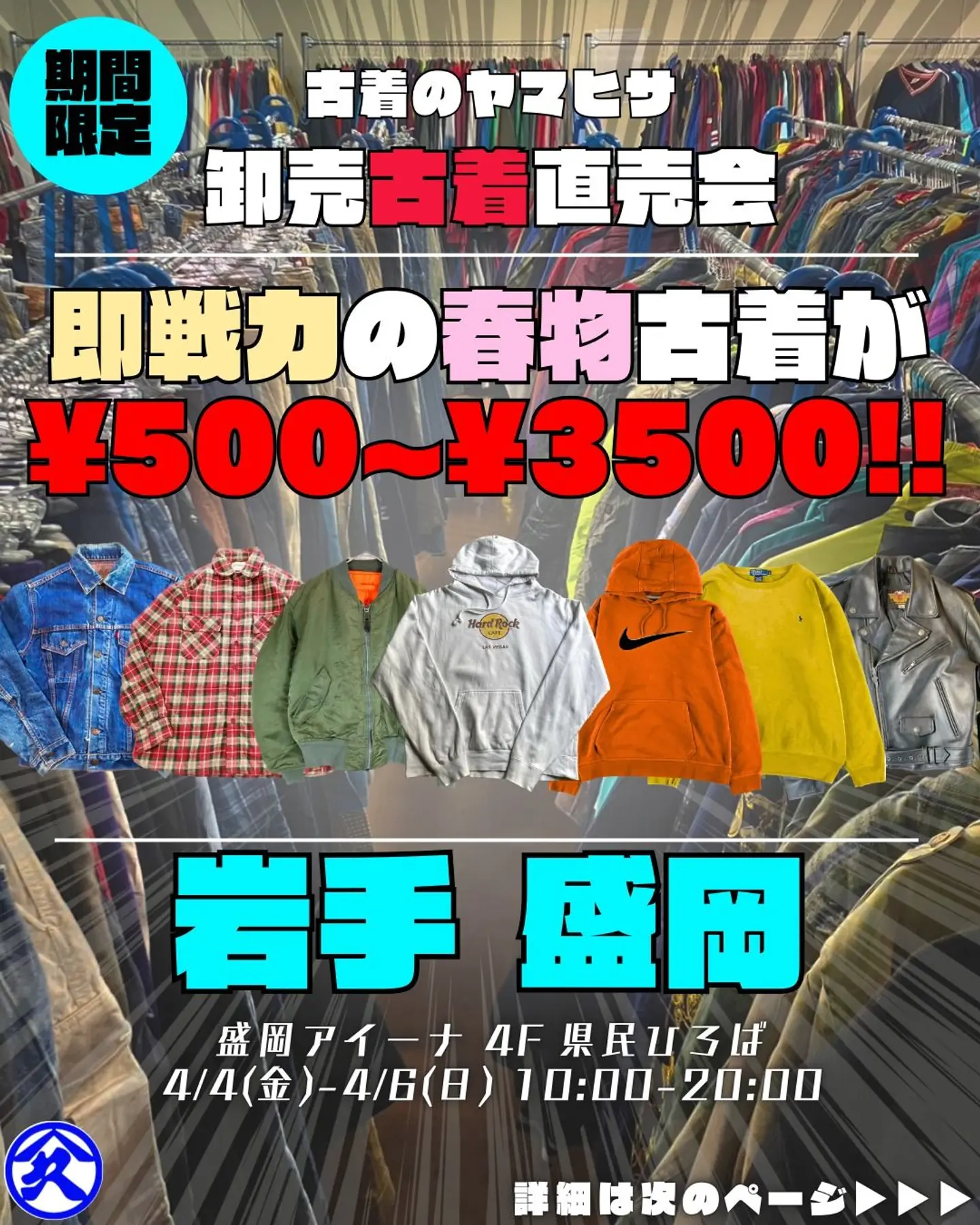 東京、大阪を拠点にUSA古着の卸売倉庫を営んでいる「古着のヤマヒサ」です。 今回盛岡アイーナ様にて3日間限定の古着直売会を開催致します。 弊社は通常、業者様専用倉庫として完全予約制の卸売を行っており、普段は一般のお客様には販売を行っておりません。 ですが今回は盛岡アイーナ様で、普段予約をお取り頂けない業者様はもちろん、一般のお客様もどなたでも自由にお越し頂く事ができるイベントを開催させて頂けることとなりました。 -ポイント- ・価格は通常卸売価格に勝るイベントスペシャルプライス。アイテム毎の全品均一価格にて、3,000点以上の商品を準備いたしております。 ・商品は全て海外バイヤーが1点1点ハンドピックした古着で、卸売ならではの多彩なラインナップがございます。 ・毎日営業中に新商品を追加します。 どのタイミングでお越しいただいても、一日に何度ご来店いただいても楽しんで頂けます。 -プライス- どんな商品でもアイテム毎の均一価格! ・メンズアイテム Tシャツ/ロンT ¥1,100 ベスト/ショーツ ¥1,400 シャツ/スウェット/ニット/フリース/パンツ ¥1,800 ジャケット ¥2,500 コート ¥3,000 ・その他アイテム ネクタイ/バンダナ/イヤリング ¥500 キャップ/ベルト/ネックレス/ブレスレット ¥1050 バッグ ¥1,500 シューズ ¥2,500 オーバーオール/オールインワン ¥3,000 KIDSアイテム ¥1,000 ショッパー S ¥30 M ¥50 L ¥100 ※レザー、ダウンのアイテムはそれぞれの価格に+¥1,000 ※全て税込価格になります。 -お支払い方法- ・現金、クレジットカード、ID、Quick Pay、各種QRコード決済がご利用いただけます。 会場によって使用できないものもございますので、現地スタッフまでお問い合わせください。 古着好きの皆様、お洒落好きの皆様、多くのお客様のご来店を楽しみにお待ち致しております。 古着のヤマヒサ (Instagramより引用)