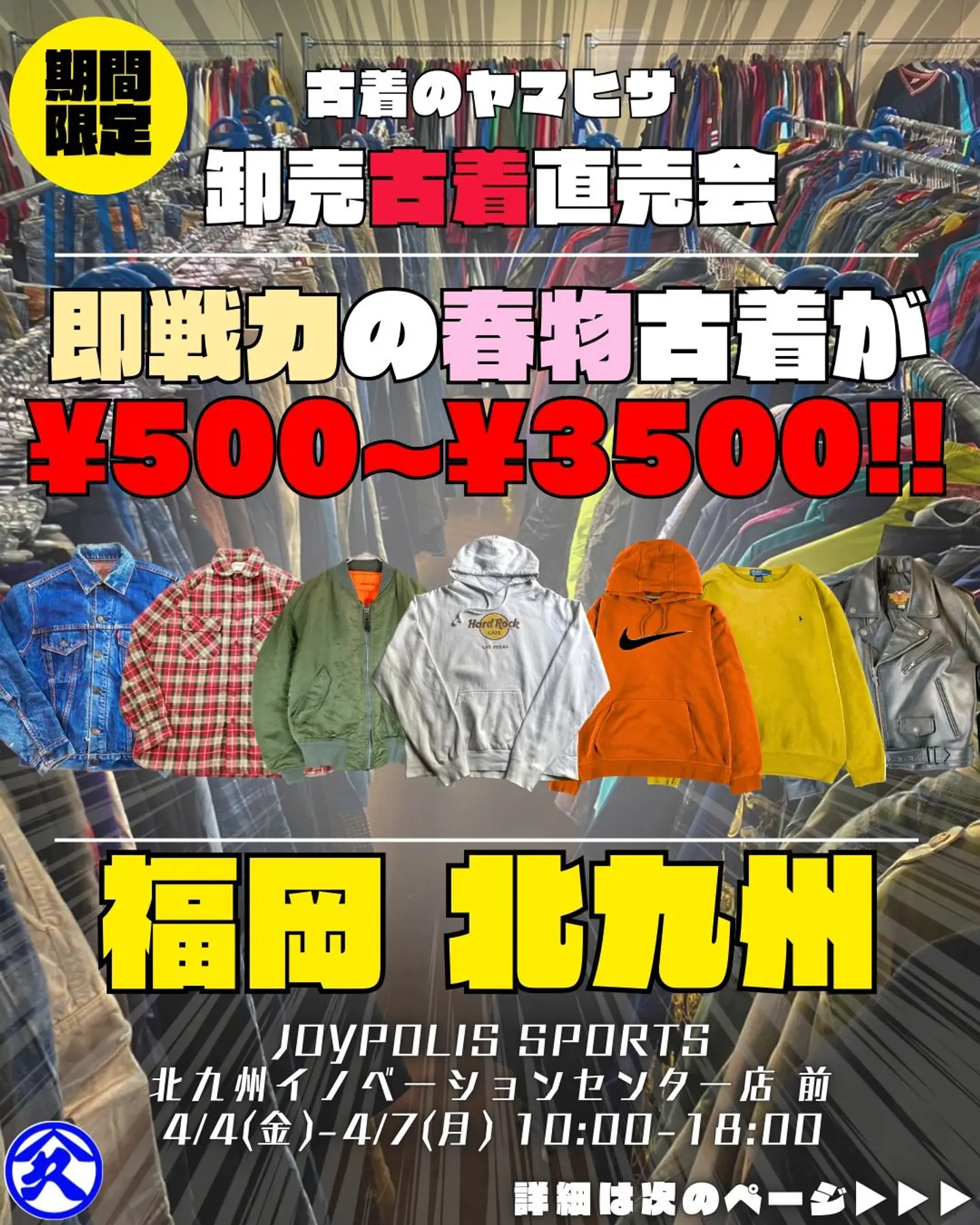 東京、大阪を拠点にUSA古着の卸売倉庫を営んでいる「古着のヤマヒサ」です。 今回北九州イノベーションセンター様にて4日間限定の古着直売会を開催致します。 弊社は通常、業者様専用倉庫として完全予約制の卸売を行っており、普段は一般のお客様には販売を行っておりません。 ですが今回は北九州イノベーションセンター様で、普段予約をお取り頂けない業者様はもちろん、一般のお客様もどなたでも自由にお越し頂く事ができるイベントを開催させて頂けることとなりました。 -ポイント- ・価格は通常卸売価格に勝るイベントスペシャルプライス。アイテム毎の全品均一価格にて、3,000点以上の商品を準備いたしております。 ・商品は全て海外バイヤーが1点1点ハンドピックした古着で、卸売ならではの多彩なラインナップがございます。 ・毎日、開店前に新商品の大量補充と、営業中2時間毎に新商品を追加します。 営業時間内どのタイミングでお越しいただいても、一日に何度ご来店いただいても楽しんで頂けます。 -プライス- どんな商品でもアイテム毎の均一価格! ・メンズアイテム Tシャツ/ロンT ¥1,100 ベスト/ショーツ ¥1,400 シャツ/スウェット/ニット/フリース/パンツ ¥1,800 ジャケット ¥2,500 コート ¥3,000 ・その他アイテム ネクタイ/バンダナ/イヤリング ¥500 キャップ/ベルト/ネックレス/ブレスレット ¥1050 バッグ ¥1,500 シューズ ¥2,500 オーバーオール/オールインワン ¥3,000 KIDSアイテム ¥1,000 ショッパー S ¥30 M ¥50 L ¥100 ※レザー、ダウンのアイテムはそれぞれの価格に+¥1,000 ※全て税込価格になります。 -お支払い方法- ・現金、クレジットカード、ID、Quick Pay、各種QRコード決済がご利用いただけます。 会場によって使用できないものもございますので、現地スタッフまでお問い合わせください。 古着好きの皆様、お洒落好きの皆様、多くのお客様のご来店を楽しみにお待ち致しております (Instagramより引用)