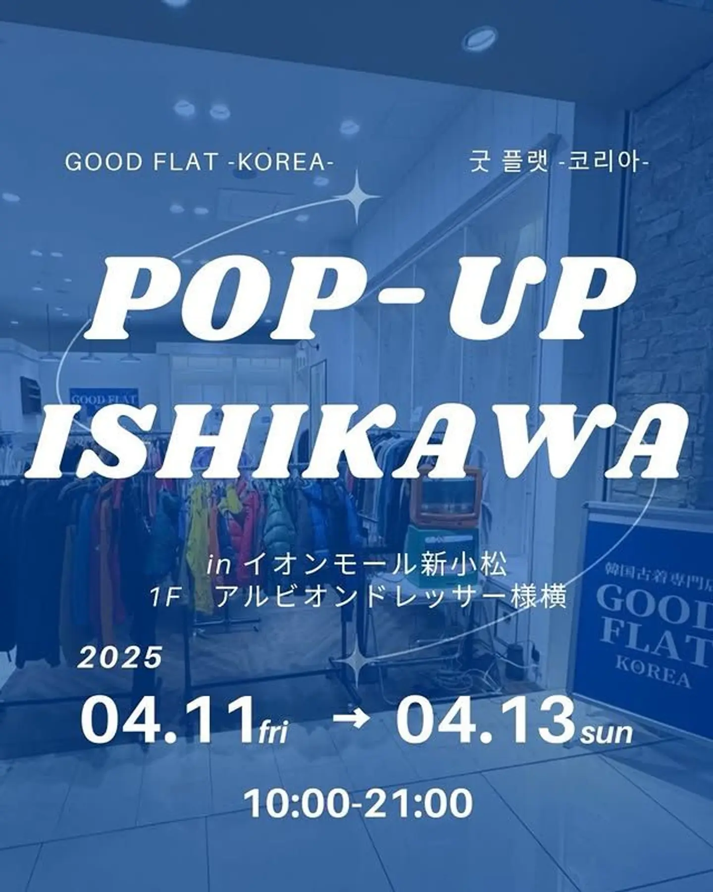 韓国カルチャーを取り入れた日本初韓国古着専門店グッドフラットコリアが石川県小松市にあるイオンモール新小松店に新規オープン GOOD FLAT-KOREA-(グッドフラットコリア)は 韓国国内で流通している若者に人気な古着で構成された『韓国古着専門店』 現在日本で流通している古着店舗では見えない韓国ブランドで構成されているのが特徴。 日本人バイヤーが、日本で流行している最新のファッショントレンドを取り入れ、日本人の好みにあったセレクトを現地で行っています。 今回は、家族で楽しめる古着屋さんをコンセプトとして、『お店の入りやすさ』『商品の買いやすさ』『商品の品質』を追求し、家族をはじめ今まで古着に触れてこなかったライト層のお客様にも、楽しんで空間創りを行っております。 <石川県> 会場:イオンモール新小松1F (アルビオンドレッサー様横) 所在地:石川県小松市清六町315 日程:2025年4月11日(金)~4月13日(日) [営業時間] 10:00~21:00 (Instagramより引用)