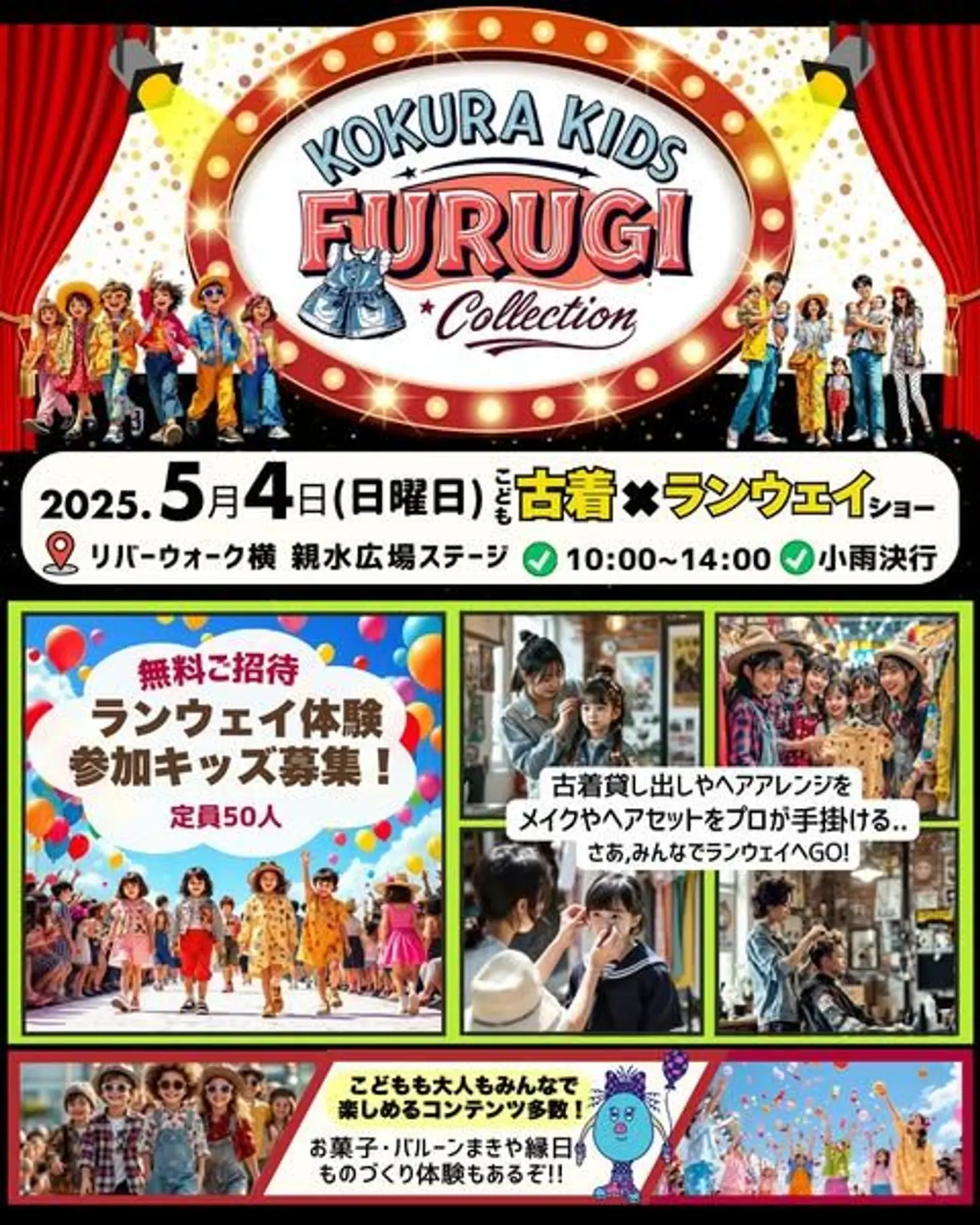 \ 参加キッズ大募集! / ✨ 「KOKURA KIDS FURUGI Collection」 ✨ 📢 ランウェイを歩いてファッションショーに出よう! 🌟 参加無料・限定50名! 🌟 📅 2025年5月4日(日) 10:00スタート 📍 リバーウォーク横 親水広場ステージ 👗 古着貸し出し&ヘアアレンジ付き! 👠 メイクやヘアセットをプロが担当! 🎉 みんなで楽しくランウェイへGO! 💡 申し込み方法 💡 プロフィールにあるリンクから🔗 🎈 ランウェイ体験だけじゃない! お菓子やバルーン、ワークショップもあるよ! おしゃれして、みんなで楽しもう✨ 📝 参加希望の方はお早めに! みんなの応募を待ってるよ!🎶 (Instagramより引用)