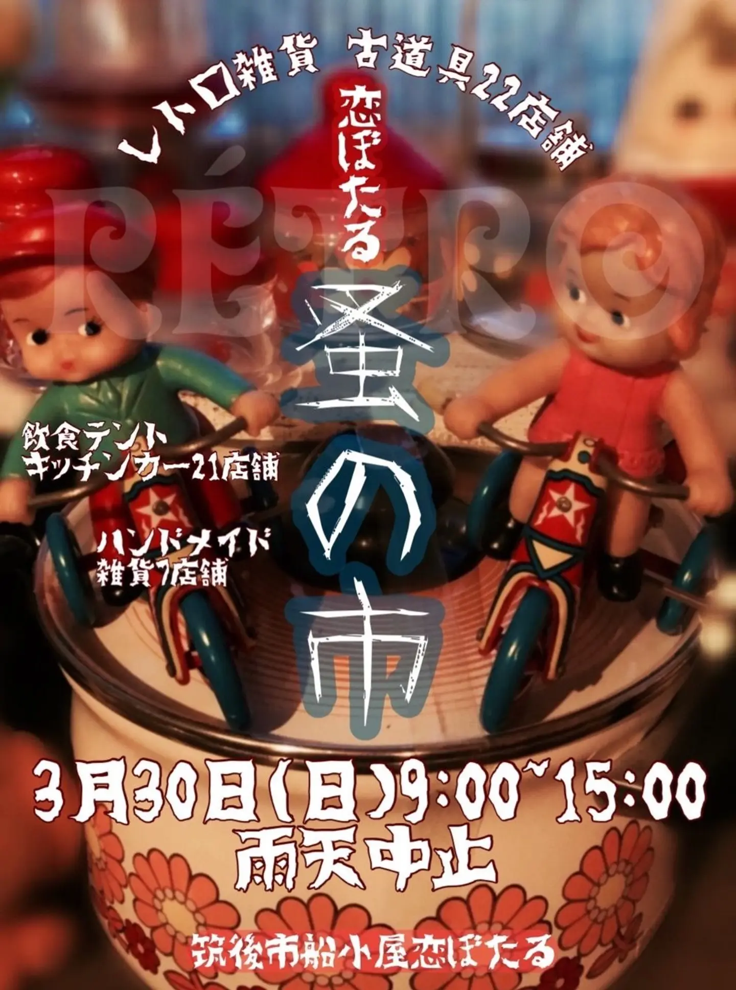 2025年3月30日(日)、福岡県筑後市にある川の駅船小屋 恋ぼたるで「恋ぼたる蚤の市」が開催されます。 レトロ雑貨・古道具・古美術・骨董・アンティーク家具・古着その他29店舗、人気の飲食・キッチンカー・ハンドメイド雑貨のお店30店舗が大集合! 宝箱が沢山集まるイベントです。 入場無料です。※雨天中止 (リンク先より引用)
