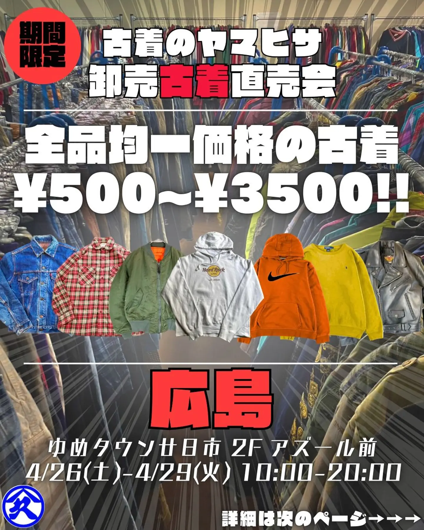 ゆめタウン廿日市 × 古着のヤマヒサ 👖🧥古着直売会🧣👗 4/26(土)~4/29(火) 10:00 〜 20:00 〒738-0023 広島県廿日市市下平良2丁目2−1 ゆめタウン廿日市 2F アズール前 東京、大阪を拠点にUSA古着の卸売倉庫を営んでいる「古着のヤマヒサ」です。 今回ゆめタウン廿日市様にて4日間限定の古着直売会を開催致します。 弊社は通常、業者様専用倉庫として完全予約制の卸売を行っており、普段は一般のお客様には販売を行っておりません。 ですが今回はゆめタウン廿日市様で、普段予約をお取り頂けない業者様はもちろん、一般のお客様もどなたでも自由にお越し頂く事ができるイベントを開催させて頂けることとなりました。 (Instagramより引用)
