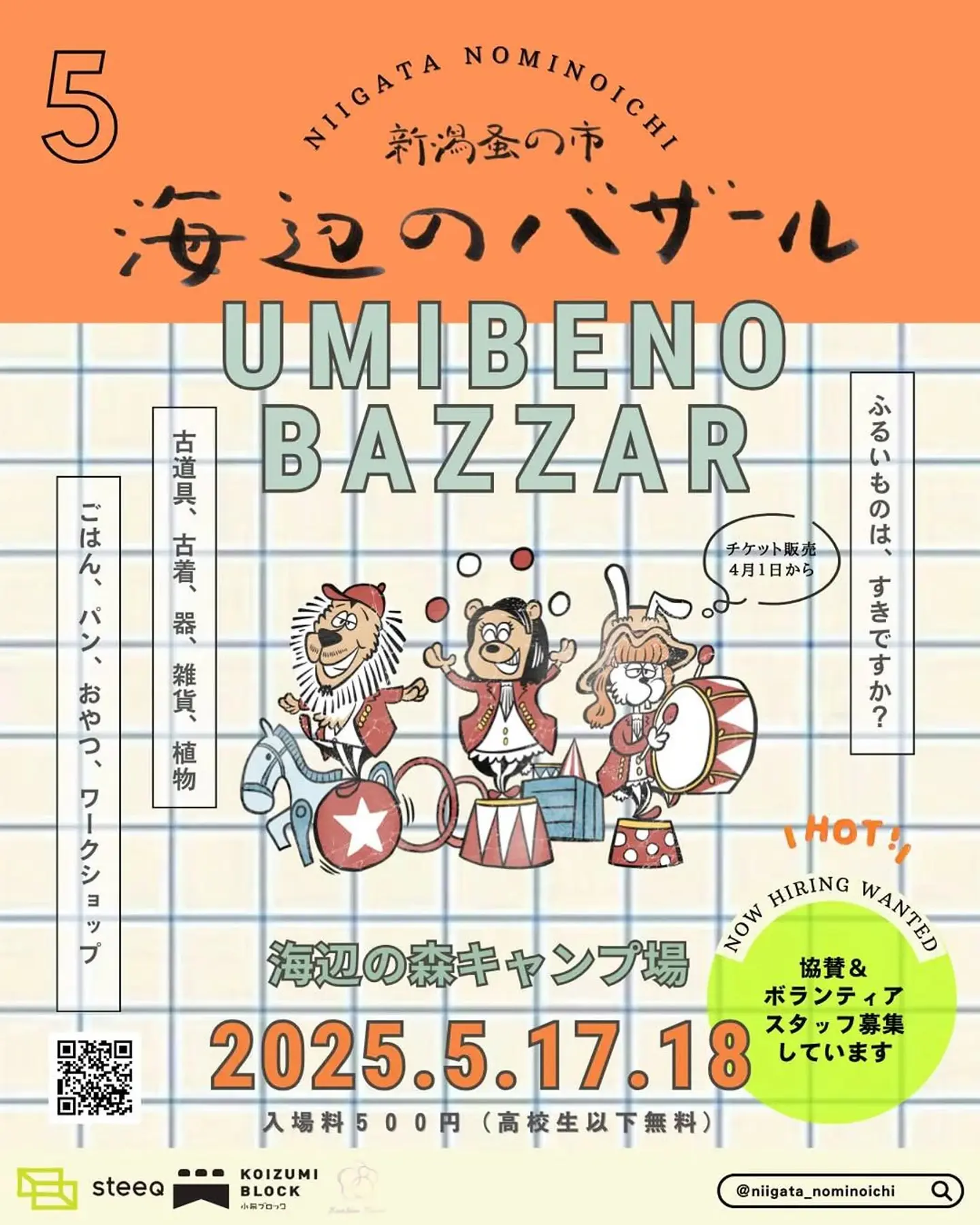 海辺のバザール〜新潟蚤の市〜 5/17日(土)10:00〜17:00 5/18日(日)10:00〜16:00 🌷入場チケット500円 高校生以下無料(学生証提示) チケットは4/1からの販売になります。 📍新潟市北区 海辺の森キャンプ場 【バイパス🚘】競馬場I.Cより車で10分 【バイパス🚘】豊栄I.Cより車で10分 【高速🚘】豊栄新潟東港ICから車で15分 🚐駐車場 一般無理駐車場⇒無料シャトルバス 一般有料駐車場(500円) 障害のある方、高齢者、妊産婦、ベビーカー専用無料専用駐車場有り(証明書確認有り)👶 駐車場は数に限りがありますのでご了承下さい。 ・会場にはテーブルやイスもありますがピクニックシート🧺のご持参も大歓迎です◎  ̄ ̄ ̄ ̄ ̄ ̄ ̄ ̄ ̄ ̄ ̄ ̄ ̄ ̄ 新潟で今までなかった蚤の市を 開催したいと集まった各々イベント を企画している古いものが好きな3人。 単にモノを買える時代だけど 古き良き失われつつあるモノに もう一度価値を生み出したいと考え 新潟で蚤の市を企画しました。 県内外の出店者を集め、手で触れ、 出店者とお客さんが交流しながら イベントを楽しんでもらえたらと思います。 この蚤の市が県外の方も足を運ぶ きっかけになるような、 新潟をもっと知ってもらえるような 古いものを好きになってもらえるような 心躍るイベントを企画します。 (Instagramより引用)