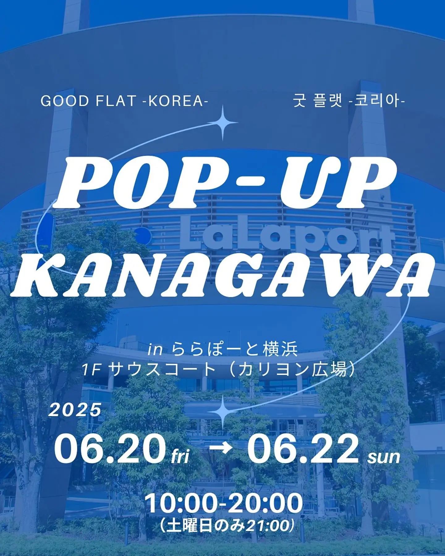 ✨ららぽーと横浜店にてPOPUP開催決定✨ 日本初の韓国古着専門店 GOODFLAT-KOREA-が 神奈川県に再上陸します🥳 会場:三井ショッピングパーク ららぽーと横浜 1階サウスコート(カリヨン広場) 所在地:神奈川県横浜市都筑区池辺町4035-1 日程:2025年6/20(金)~6/22(日) 営業時間:10:00~20:00 ⚠️土曜日のみ21:00まで営業 駐車場:駐車台数 4,600台 ※平日無料🆓 ※土日祝日は、¥1000以上のお買い上げにより パーキングサービス1時間無料となります🆓 ¥1000以上→1時間無料 ¥2000以上→2時間無料 ⋮ 交通情報:JR横浜線「鴨居」駅より徒歩7分 【124系統】 センター南⇔ららぽーと横浜西⇔笹山団地中央 センター南⇔ららぽーと横浜西⇔緑車庫前 ※ららぽーと横浜西 下車徒歩5分 【28系統】 中山駅北口⇔ららぽーと横浜⇔新羽駅 市営バス時刻表はこちらから http://navi.hamabus.jp/ お車交通情報は画像をご覧くださいませ😊 (Instagramより引用)