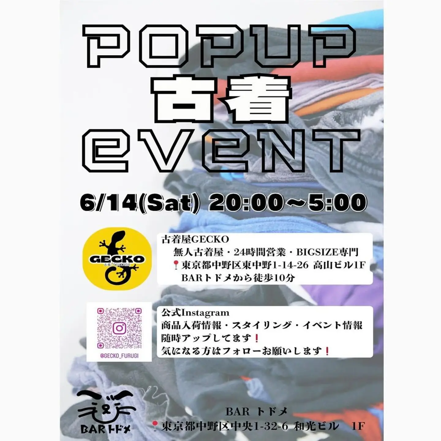 いつも商品を置かせてもらっている 中野坂上にあるBarトドメさんにて POPUPイベントを開催させて頂きます🙌 🗓️6/14(土) 🕑20:00〜5:00 🦭Barトドメ @todome_nakanosakaue 📍東京都中野区中央1-32-9和光ビル1F 当日は夏物のアイテム、 ビッグサイズのアイテムを中心に出品致します✨ お近くにお越しの際は ぜひお立ち寄り頂けますと嬉しいです☺️ 皆様お誘い合わせの上ご来店をお待ちしております❤️🔥 🦎古着屋GECKO フルギヤゲッコー🦎 📍東京都中野区東中野1-14-26高山ビル1階 🈺無人古着屋 ⏰24時間営業・年中無休 🚃東中野駅東口徒歩5分/西口徒歩8分 🚃中野坂上駅A1出口徒歩10分 (Instagramより引用)