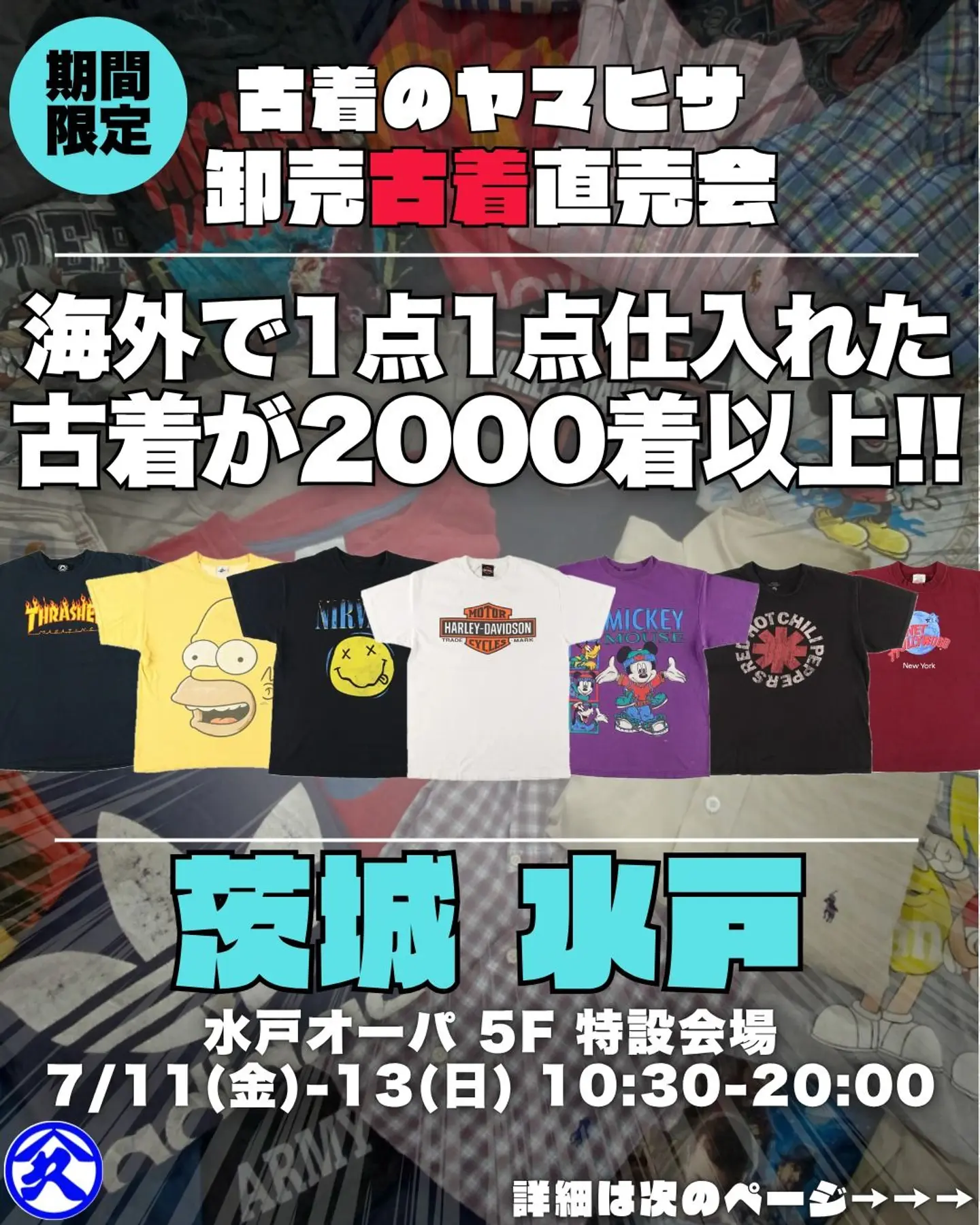 東京、大阪を拠点にUSA古着の卸売倉庫を営んでいる「古着のヤマヒサ」です。 今回水戸オーパ様にて3日間限定の古着直売会を開催致します。 弊社は通常、業者様専用倉庫として完全予約制の卸売を行っており、普段は一般のお客様には販売を行っておりません。 ですが今回は水戸オーパ様で、普段予約をお取り頂けない業者様はもちろん、一般のお客様もどなたでも自由にお越し頂く事ができるイベントを開催させて頂けることとなりました。 -ポイント- ・価格は通常卸売価格に勝るイベントスペシャルプライス。アイテム毎の全品均一価格にて、2,000点以上の商品を準備いたしております。 ・商品は全て海外バイヤーが1点1点ハンドピックした古着で、メンズ、レディースともに卸売ならではの多彩なラインナップがございます。 ・毎日、開店前に新商品の大量補充と、営業中2時間毎に新商品を追加します。 営業時間内どのタイミングでお越しいただいても、一日に何度ご来店いただいても楽しんで頂けますよう、新商品を追加いたします。 (Instagramより引用)