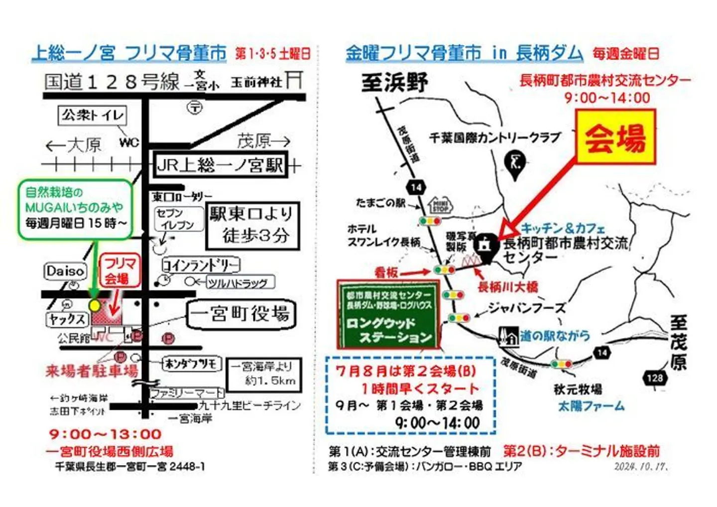ふりそそぐ太陽と鮮やかな緑に囲まれたファミリーリゾート、長柄町。 森林と湖に囲まれた爽やかな会場で、 日用雑貨からビンテージ・骨董品まで多彩な商品が揃っています。 穴場のフリーマーケットで、お宝があなたを待っています。 7月8月は、交流ターミナル前駐車場で開催します。 (交流センターのプール、バンガロー、BBQ開設のため) 金曜フリマ骨董市は、2020年8月から睦沢町の道の駅つどいの郷で始めました(184回)。 会場の都合により昨年(2024年)4月より、長柄町に会場を移してから1年になります。 皆様のご協力で、出会いと交流の広場に育てていきたいと思います。よろしくお願いします。 千葉市・市原市とも隣接しています ドライブがてら、是非ご来場ください。 きっといい出会いがあることでしょう。 ・日用品、アクセサリから、ビンテージ、骨董品まで ・小銭 農具・工具 などなども 多種多様な出店者が集まっています <出店者募集> 会場が広くなり、ゆとりがあります。試しに出店してみませんか。 お問い合わせください。 (初回は無料、町民割引あり、教育・福祉関係は無料) ・睦沢町での実績: 184回 出店数は25~30、来場者は200~300人(天候にもよる) 引き続き、皆でお楽しみいただければ幸いです。 それでは、会場でお待ちします。 合掌 (ホームページより引用)