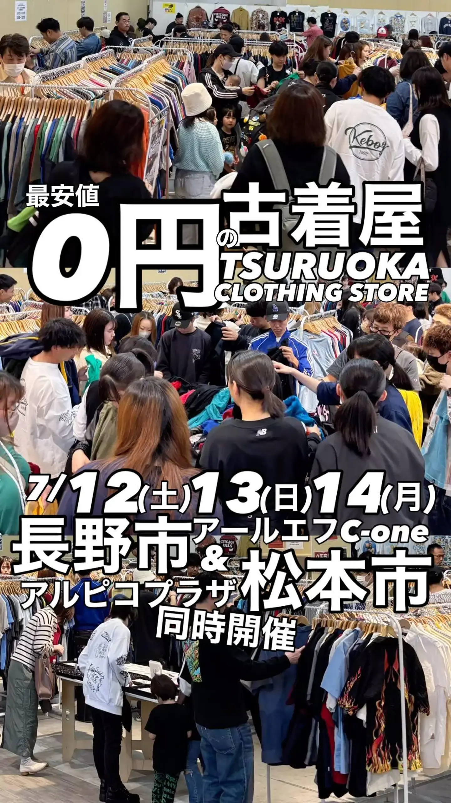 県内同時開催 7/12(土)13(日)14(月) 【長野市】アールエフC-one 4階10:30〜19:30 【松本市】アルピコプラザ 6階10:00〜19:00 ・アールエフC-one 〒380-0822長野県長野市南千歳町826 4階 ・アルピコプラザ 〒390-0815長野県松本市深志1丁目2-30 6階 【TSURUOKA CLOTHING STORE】 最安値0円の古着屋ツルオカクロージングストア(通称ツルクロ)は、世界中からセレクトした古着、ブランド、ビンテージ、リメイク、オリジナル、アート作品など、多種多様なアイテムを3,000点以上、最安値0円から取り扱い、販売する期間限定イベント、ショップです。 0円商品も随時補充、追加いたします。公平性を考慮し、0円商品はお一人様1日1点までに限らせていただきます。0円の値札が付いた人気アイテムが多数店内にまざっておりますので、宝探し気分でお探しください。 (Instagramより引用)