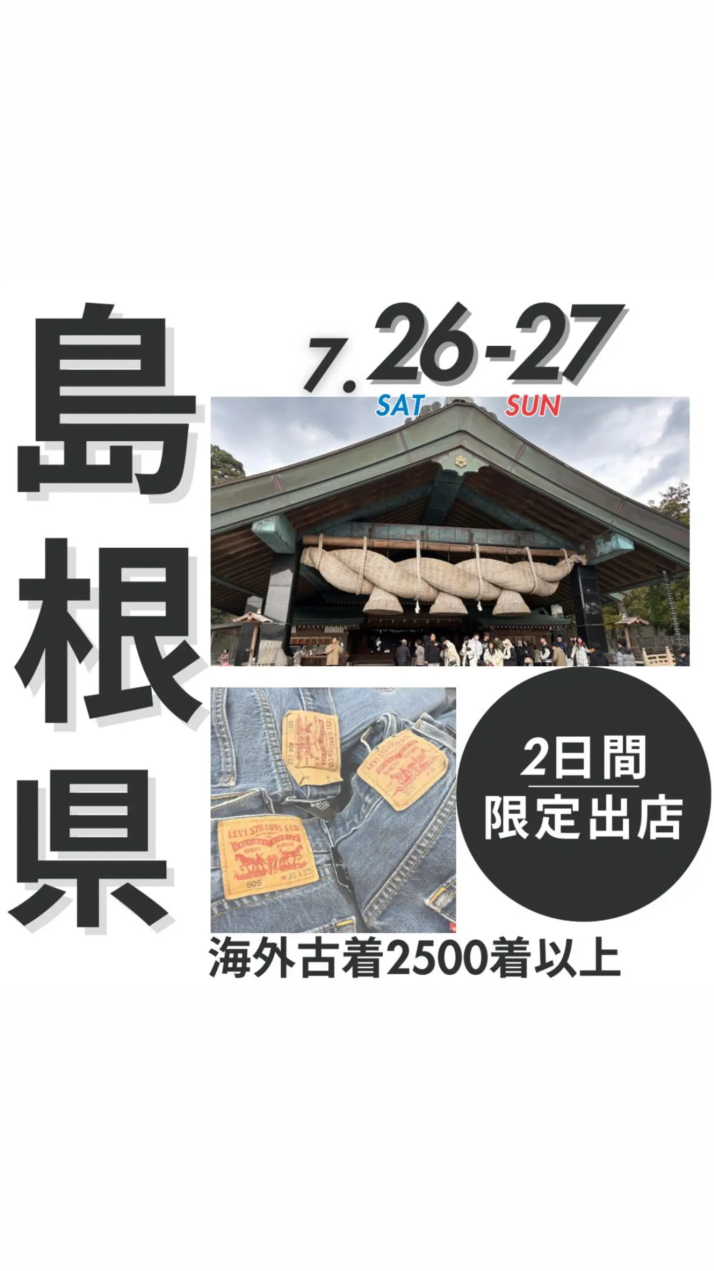 島根県出雲市で2日間限定の古着イベント開催❗️ 【日程】 2025年7/26日(土)〜7/27日(日) 【会場】 イオンモール出雲 1F もめんコート 【営業時間】 10:00〜20:00 ✅ 厳選US古着 ✅ 70s〜00sのヴィンテージ古着 ✅ トレンドアイテム多数 【お支払い方法】 ・現金 ・クレジットカード ・paypay ・メルペイ、楽天pay、AUpay 等各種QRコード決済 ・QUICpay 🔥移動古着屋🔥 1500円〜2万円まで幅広いアイテム展開✨ 2500着以上の古着が集結🌈 ============================== イベント限定セール開催🎁 海外輸入の個性的な古着やブランド古着を多数ご用意! ============================== みなさまのご来店お待ちしております🔥 (Instagramより引用)