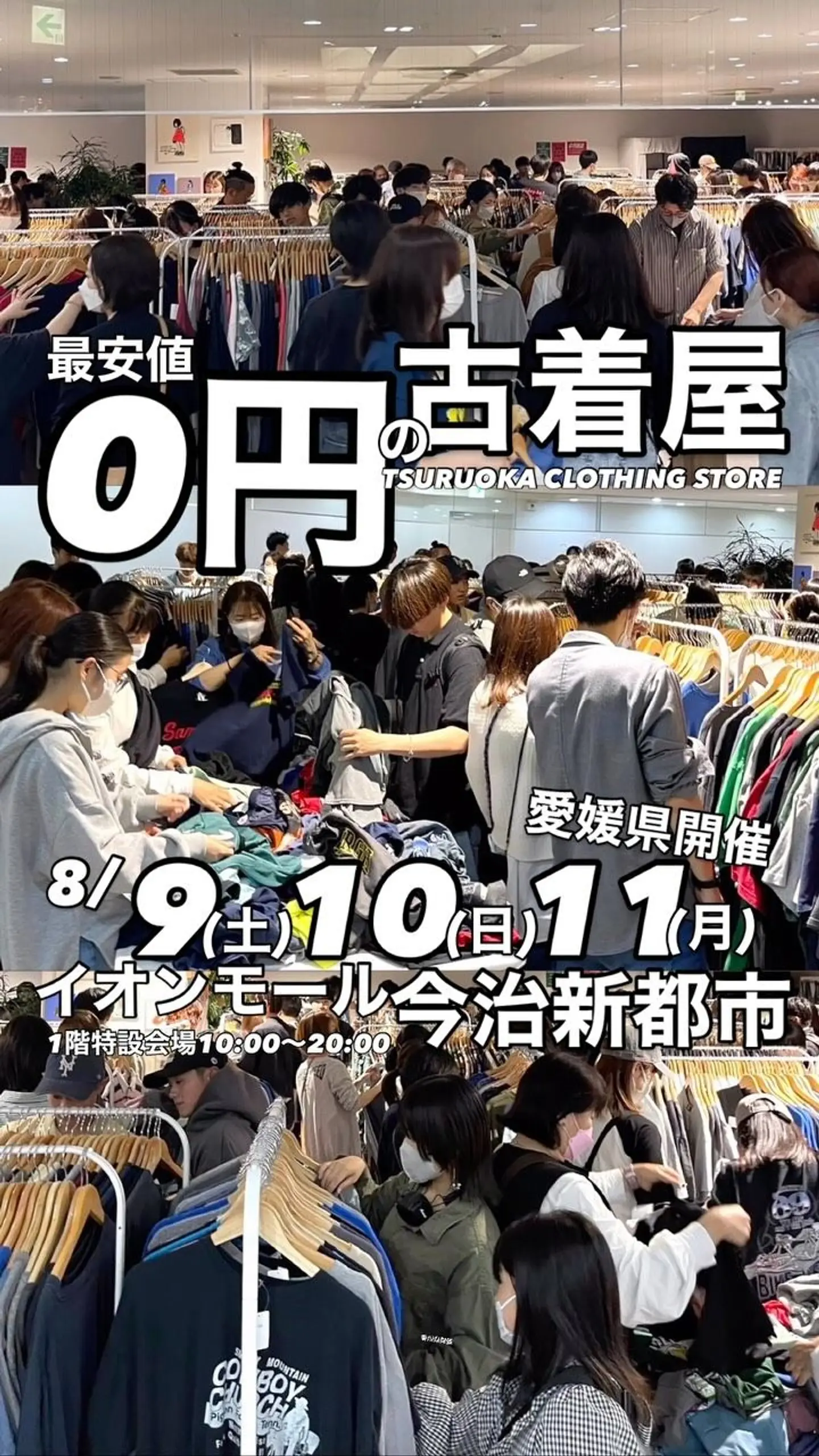 最安値0円の古着屋ツルクロ愛媛県イオンモール今治新都市1階で三日間限定開催 【イオンモール今治新都市】 8/9(土)10(日)11(月) 10:00〜20:00 1階特設会場(H&M様横) 〒794-0068 愛媛県今治市にぎわい広場1番地1 【TSURUOKA CLOTHING STORE】 最安値0円の古着屋ツルオカクロージングストア(通称ツルクロ)は、世界中からセレクトした古着、ブランド、ビンテージ、リメイク、オリジナル、アート作品など、多種多様なアイテムを3,000点以上、最安値0円から取り扱い、販売する期間限定イベント、ショップです。 0円商品も随時補充、追加いたします。公平性を考慮し、0円商品はお一人様1日1点までに限らせていただきます。0円の値札が付いた人気アイテムが多数店内にまざっておりますので、宝探し気分でお探しください。 【お支払い方法】 現金、PayPay、クレジットカード、iD、QUICPay、交通系電子マネー (Instagramより引用)