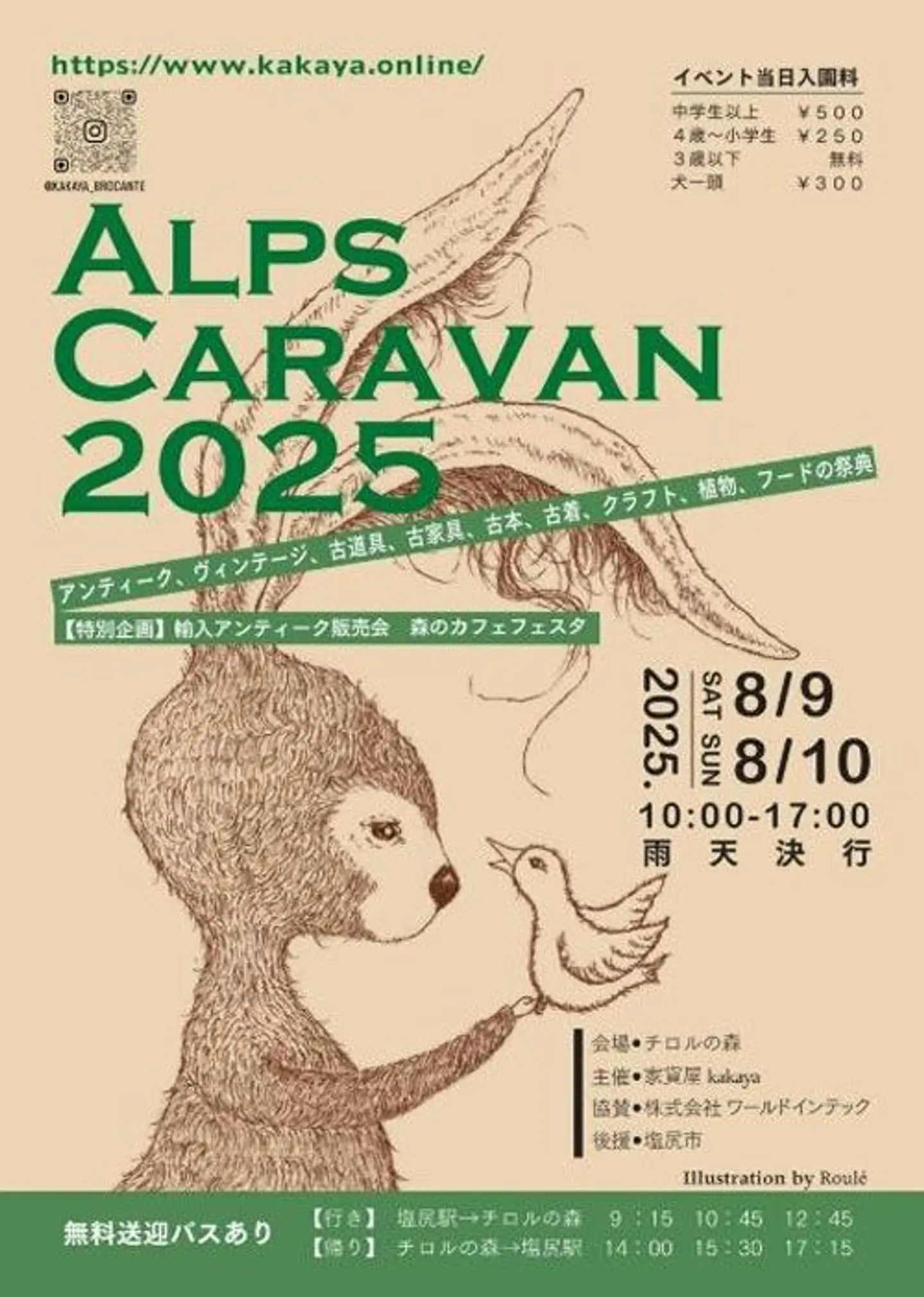 【ALPS CARAVAVN 2025 出店者発表!】 ◇追加店舗あり 長野県塩尻市の自然の中で行われる、アンティーク・古道具・ブロカント・昭和レトロ・古着・クラフト・植物が並ぶ祭典です。 珈琲やスイーツを森の中で楽しむ「森のカフェフェスタ」や音楽や大道芸もお楽しみに。 (Instagramより引用)