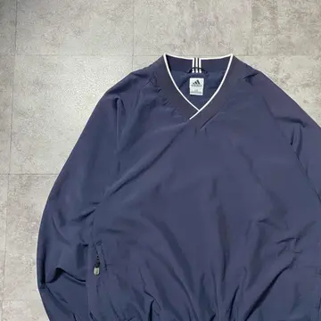 00s アディダス 刺繍アームロゴ ラインリブ ネイビー ナイロンプルオーバー