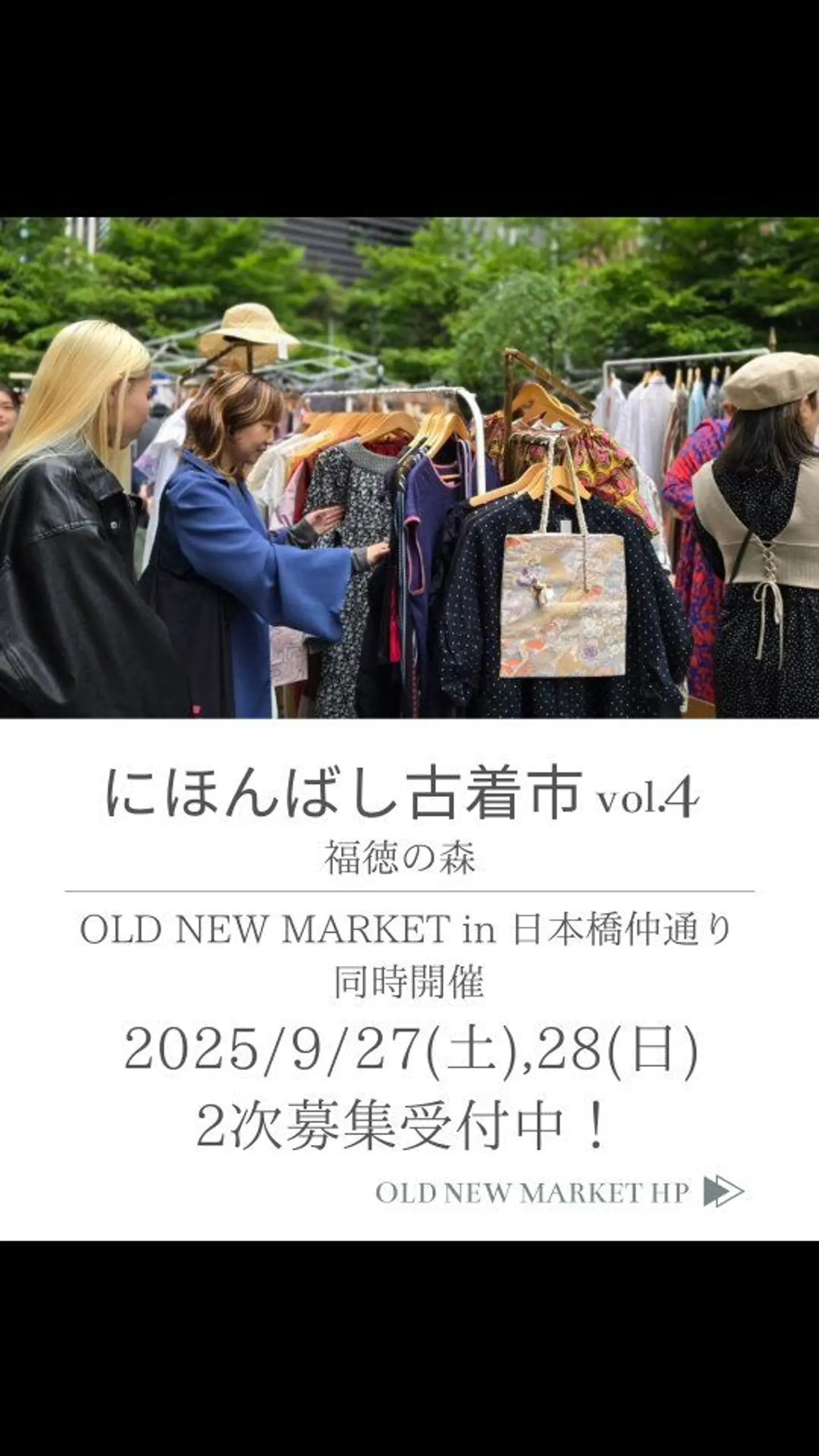今回で4回目となる「にほんばし古着市」では、アメリカやヨーロッパそして日本と様々な土地で、様々な時を経て愛されてきた古着の数々が日本橋ならではの形で集まります。回を重ねるごとに賑わいを見せる古着市。幅広い層のお客様にご来場いただいております。 福徳神社(芽吹神社)をはさみコレド室町仲通りでは恒例のOLD NEW MARKETが同時開催され賑わいが広がります。 たくさんの「古き新し」を愛するみなさまとお会いできますことを楽しみにしております。 (Instagramより引用)