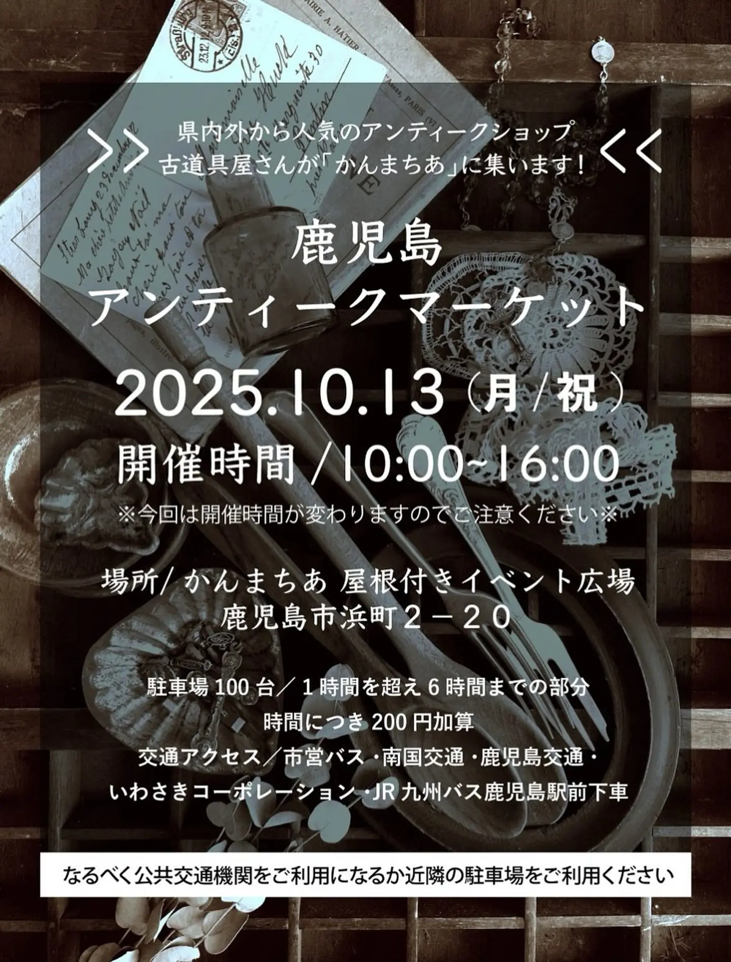 【鹿児島アンティークマーケット】 Kagoshima Antique Market 2025年10月13日月曜日10時〜16時 ※月曜日祝日10時スタートと今回イレギュラーです! ご注意ください‼️ 鹿児島市「かんまちあ」屋根付きイベント広場にて開催!今回も県内外より人気のお店が大集合🌸 鹿児島アンティークマーケットは、古道具、家具、レトロ雑貨、古着、西洋アンティーク、アメトイ、生花、ドライフラワー、グリーン、焼き菓子、パン、コーヒーを楽しめる、古物好きにはたまらない楽しいイベントです✨ (Instagramより引用)