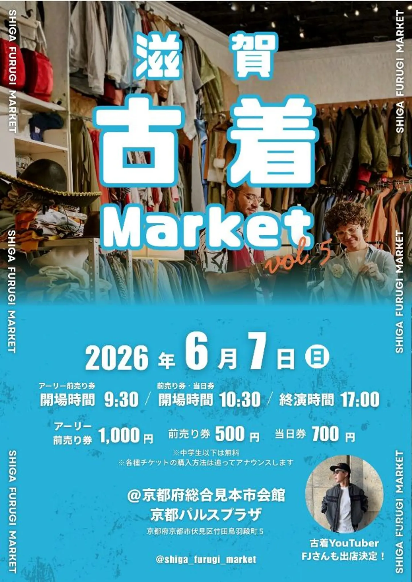 ■イベントの注目ポイント ・過去最大規模!全国から35店舗が集結 北は関東、南は沖縄まで、全国各地から有名古着店・ヴィンテージショップが京都に大集合。店舗数・敷地面積ともに過去最大規模となります! ・古着以外のコンテンツも大充実 厳選された古着はもちろん、ヴィンテージ雑貨や家具、さらに会場で楽しめるこだわりのフードエリアもご用意しています。 ・スペシャルゲスト出店 古着好きから絶大な支持を集める人気古着YouTuber「FJ」さんの出店も決定しています! ■イベント概要 名称: 滋賀古着マーケット Vol.5 日時: 2026年6月7日(日)10:00〜17:00 場所: 京都パルスプラザ 大展示場(京都府京都市伏見区竹田鳥羽殿町5) ※約550台収容の無料駐車場完備! 車でのご来場も大歓迎です。 入場料: 備考をご確認ください ■前売り券販売サイト: https://tiget.net/events/477248?utm_source=ig&utm_medium=social&utm_content=link_in_bio ■公式Instagram: https://www.instagram.com/shiga_furugi_market/ ■アクセス 【電車・バスでのアクセス】 ・竹田駅から(地下鉄烏丸線・近鉄京都線) 北西4番出口から市バスまたは京阪バスに乗車し、「パルスプラザ前」で下車すぐ。 駅から徒歩の場合は、約15分です。 ・中書島駅から(京阪本線) 北出口から市バスまたは京阪バスに乗車し、「パルスプラザ前」で下車すぐ。 ・京都駅から(直通バス) 京都駅八条口から直通バス「京都らくなんエクスプレス(R'EX)」に乗車し、「京都パルスプラザ・京セラ前」で下車(所要時間約15分)。 【車でのアクセス】 ・名神高速道路から 「京都南IC」から国道1号を南(枚方方面)へ進み、2つ目の信号「赤池」交差点を左折、さらに2つ目の信号(油小路通)を左折します(京都南ICから約3分)。※大阪方面からの場合は、京都南・第2出口をご利用ください。 ・第二京阪道路から 「巨椋池IC」から油小路通を北へ進みます(巨椋池ICから約10分)。