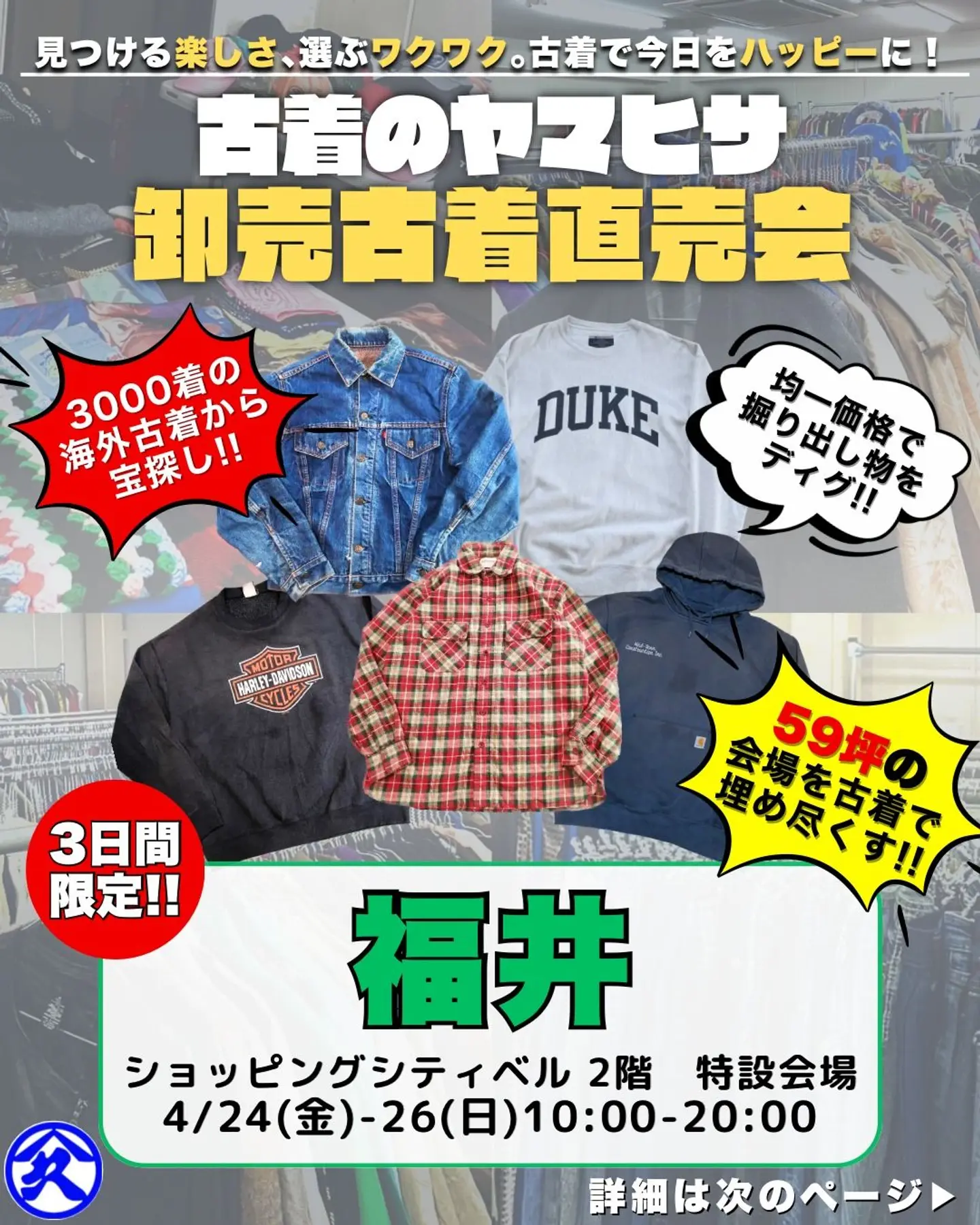 東京、大阪を拠点にUSA古着の卸売倉庫を営んでいる「古着のヤマヒサ」です。 今回ショッピングシティ・ベルにて3日間限定の古着直売会を開催致します。 弊社は通常、業者様専用倉庫として完全予約制の卸売を行っており、普段は一般のお客様には販売を行っておりません。 ですが今回はショッピングシティ・ベルで、普段予約をお取り頂けない業者様はもちろん、一般のお客様もどなたでも自由にお越し頂く事ができるイベントを開催させて頂けることとなりました。 -ポイント- ・価格は通常卸売価格に勝るイベントスペシャルプライス。アイテム毎の全品均一価格にて、3,000点以上の商品を準備いたしております。 ・商品は全て海外バイヤーが1点1点ハンドピックした古着で、卸売ならではの多彩なラインナップがございます。 ・毎日営業中に新商品を追加します。 どのタイミングでお越しいただいても、一日に何度ご来店いただいても楽しんで頂けます。 (公式Instagramより引用)