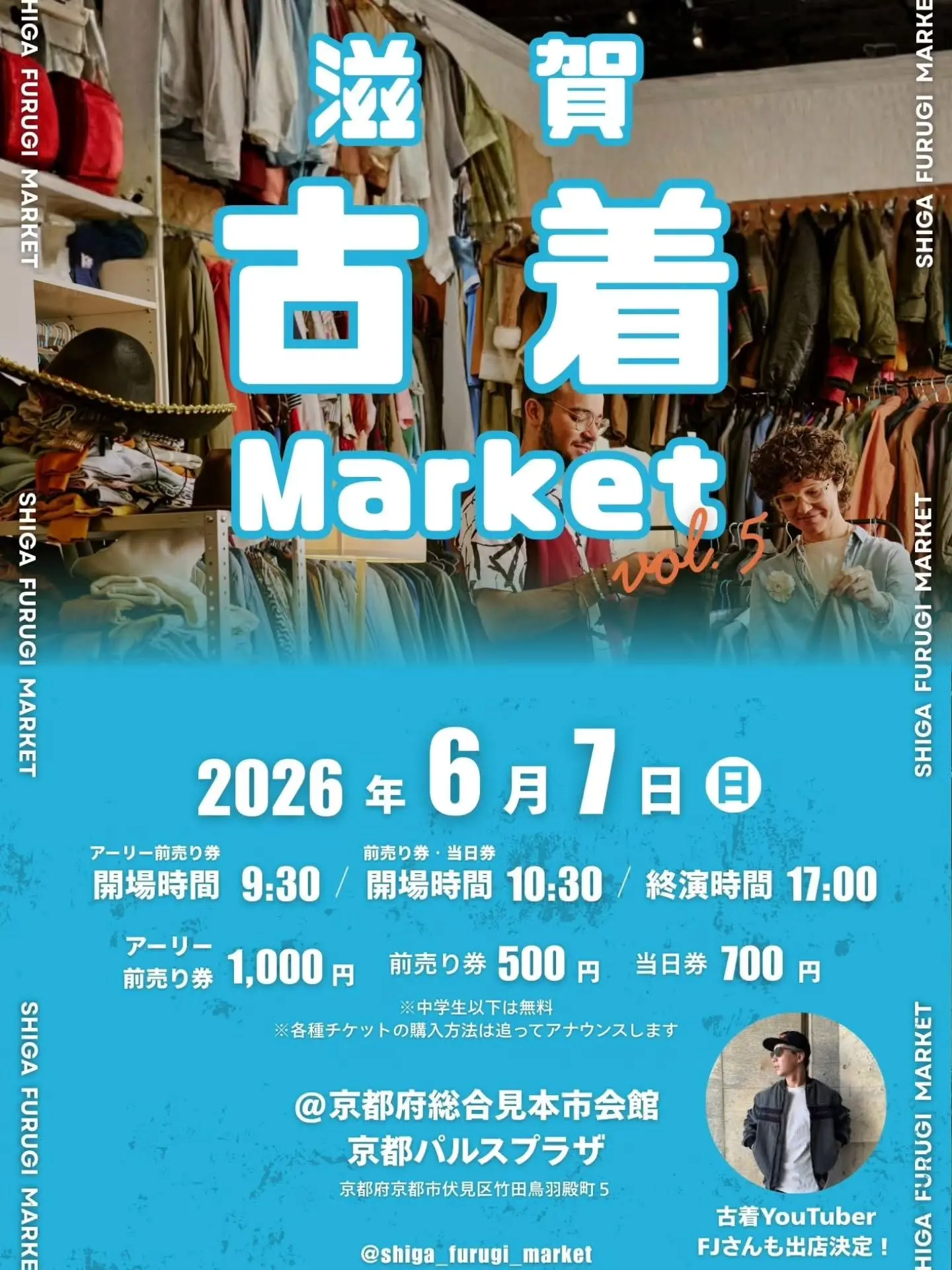 「古着」をテーマにした京滋最大級の大型イベント 『滋賀古着Market Vol.5』 2026.6.7(日)開催! 「滋賀県に古着のイベントがない」 そんなお客様との会話から始まったこのマーケット。 小規模からの挑戦としてスタートし、 今回でついに第5回を迎えます。 今回の舞台は、滋賀を飛び出し「京都パルスプラザ」。 いつも支えてくださっている皆様へ 感謝を形にするための過去最大スケールでの開催です。 1800㎡という広大な会場で、 ゆったりと「特別な一着」との出会いをお楽しみください。 (公式Instagramより引用)