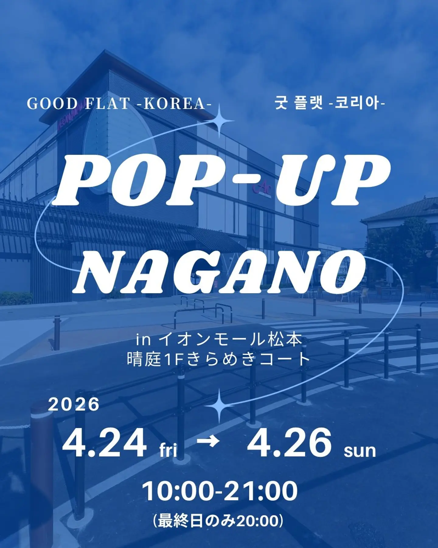 ✨イオンモール松本(長野県)にて3日間限定のPOPUP開催決定✨ 日本初の韓国古着専門店 『GOODFLAT-KOREA-』 大熱狂を生んだ長野県に再上陸🔥 韓国ファッションの今が体験できる 3日間限定POPUP🎉 お気に入りを見つけに来てね🛍️ (公式Instagramより引用)