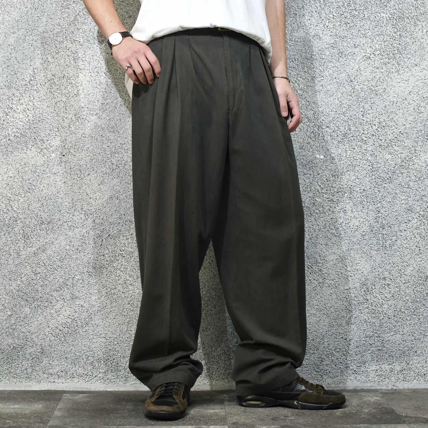古着 玉虫色 カーキ レーヨン スラックス ドレープシルエット ワイドパンツ タックパンツ