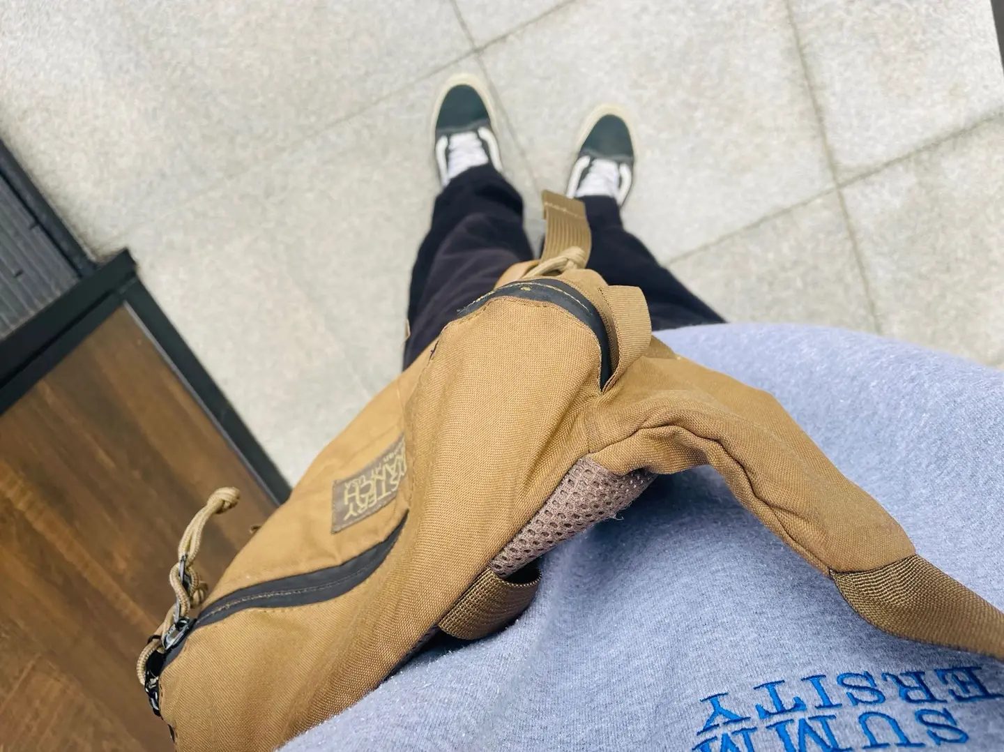 病院行くだけだけど。 帰り道にコーヒーでも飲もうって日 ミスランボディバック 00sトレーナー コーデュロイパンツ オールドスクール